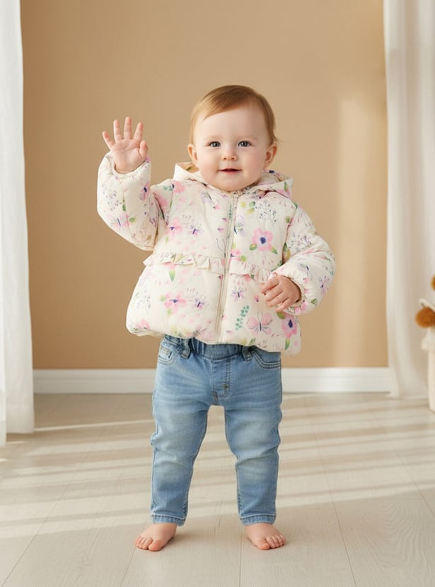 Keep your little one wonderfully warm in this charming girls floral print heavy jacket, designed for chilly days. This hooded jacket for girls features a soft fleece lining and a full zip closure, ensuring she stays snug and protected from the elements. The delightful ruffle detail adds a playful and stylish touch to the padded jacket design, making it a lovely addition to her seasonal wardrobe. It is the perfect outerwear piece for all her outdoor adventures, combining practicality with a sweet, cheerful aesthetic.