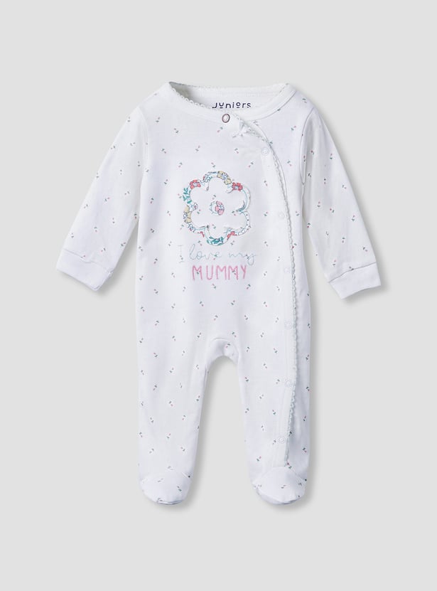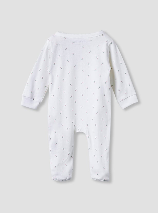 Tuck your little one into a world of softness and sweet dreams with this floral print sleepsuit. Adorned with an adorable floral print, this sleepsuit is perfect for adding a touch of charm to bedtime while keeping your baby girl warm and cosy. The long sleeves keeps your baby snug during cooler nights or air-conditioned rooms. The front button closure allows quick and convenient dressing and diaper changes.