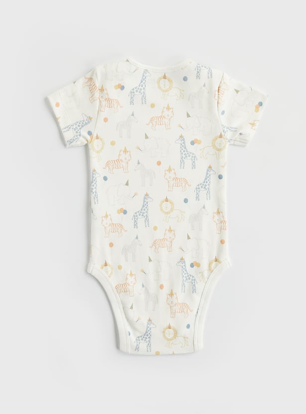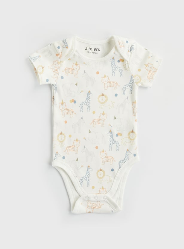 Elevate your little one's style in this preppy bodysuit that is styled in a graphic print fabric and is completed with a round neck, half sleeves, and a diaper closure.