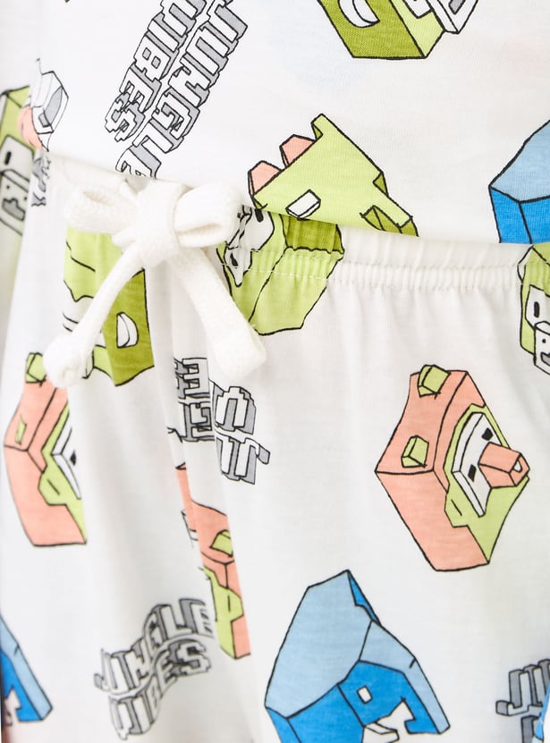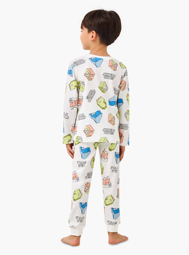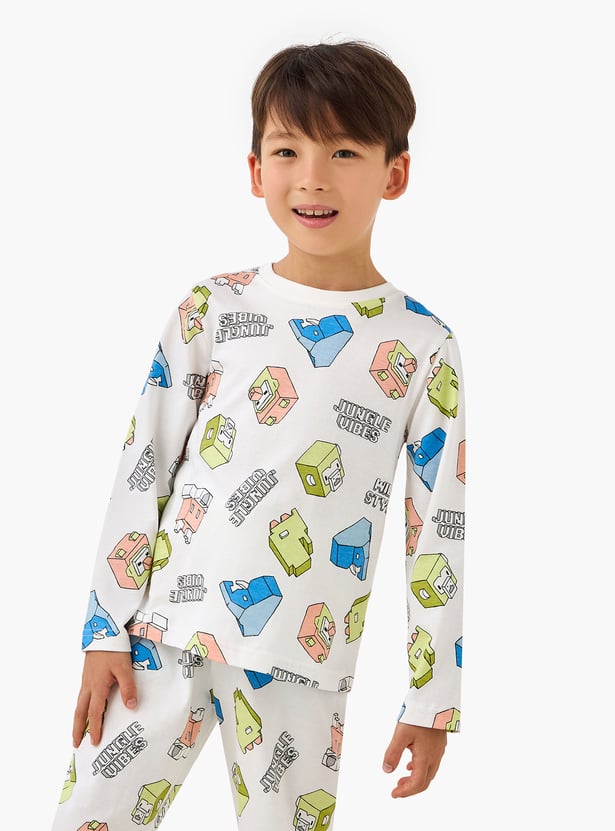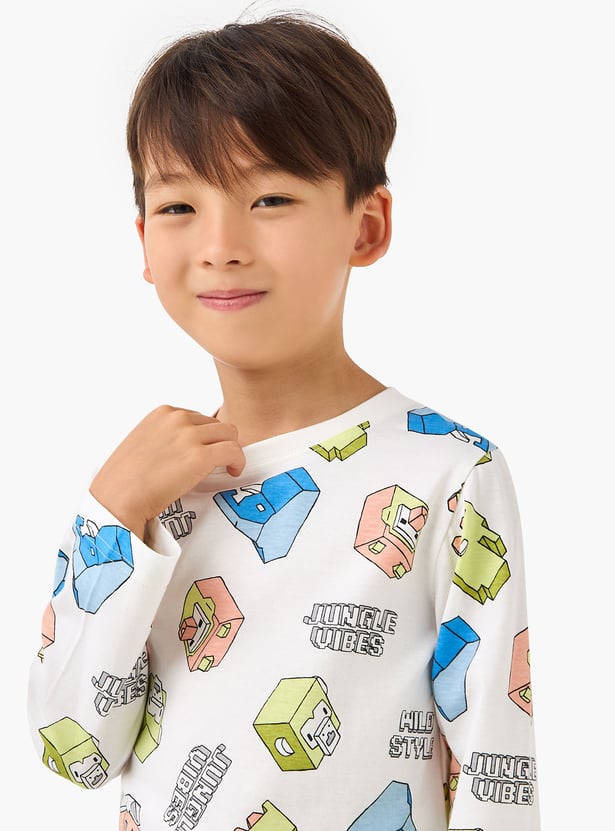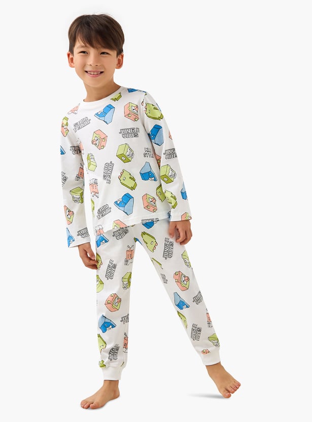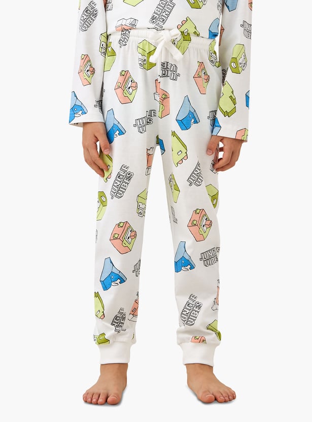 This juniors graphic print t-shirt and pyjama set is perfect for cosy nights and relaxed lounging. The long-sleeved t-shirt features a playful all-over graphic print, paired with matching pyjamas designed for a snug yet comfortable fit that allows easy movement. Made from soft, breathable fabric.