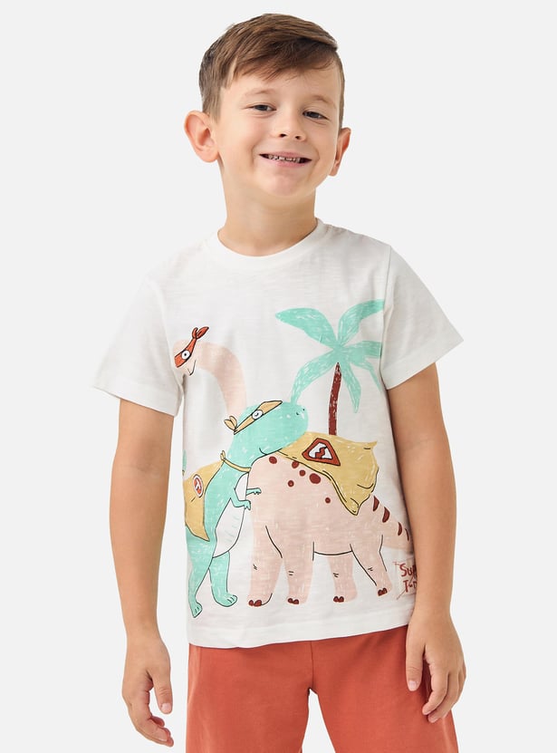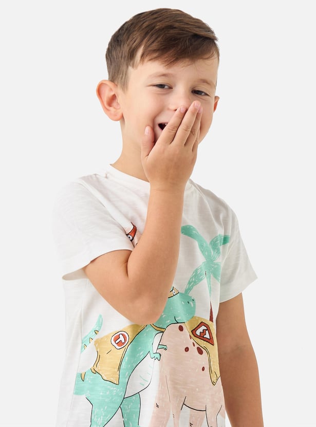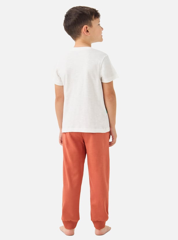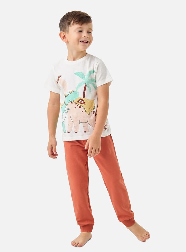 Keep your boy comfortable and stylish with this graphic print t-shirt and solid pyjama set. Made from soft fabric, the t-shirt features short sleeves and a fun graphic print, perfect for everyday wear. Paired with cosy jogger-style pyjamas, this set ensures a snug and relaxed fit, ideal for lounging or bedtime.