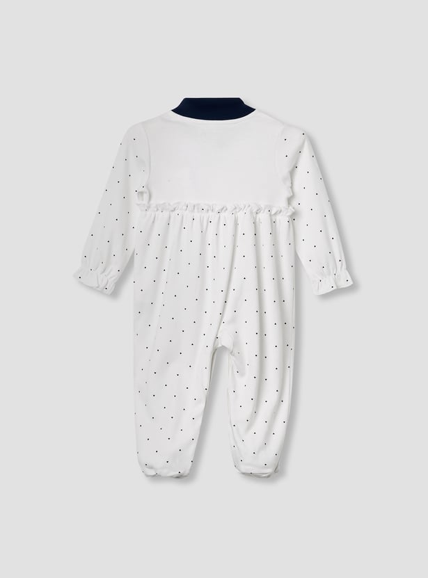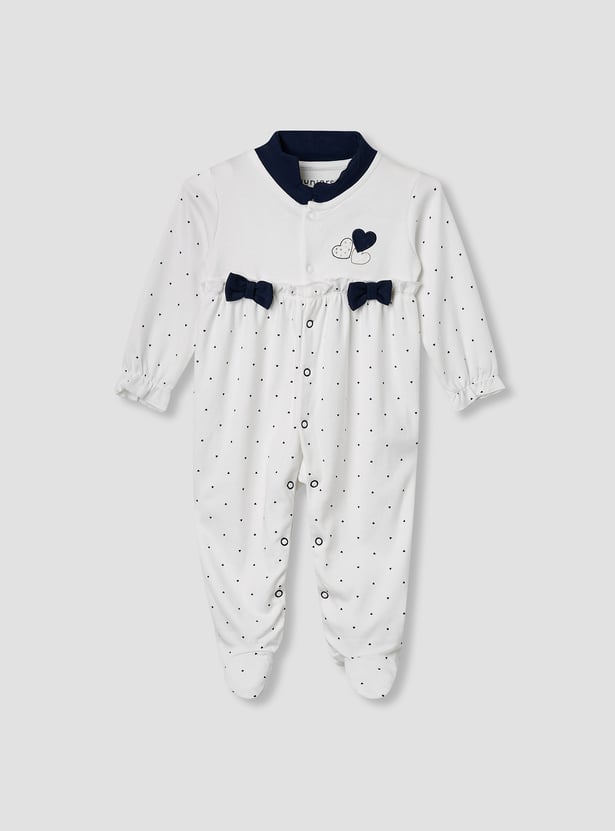 Dress your baby girl in comfort with this heart print sleepsuit featuring closed feet and long sleeves. Crafted from soft, skin-friendly fabric to keep her snug all night. The heart pattern adds a loving, playful touch. Snap buttons ensure quick diaper changes. Perfect for naptime or a cosy night's sleep.