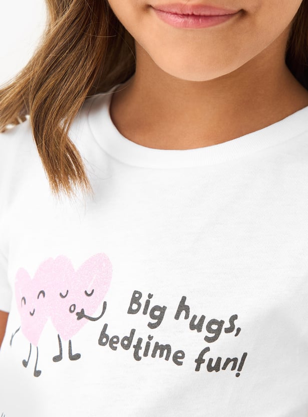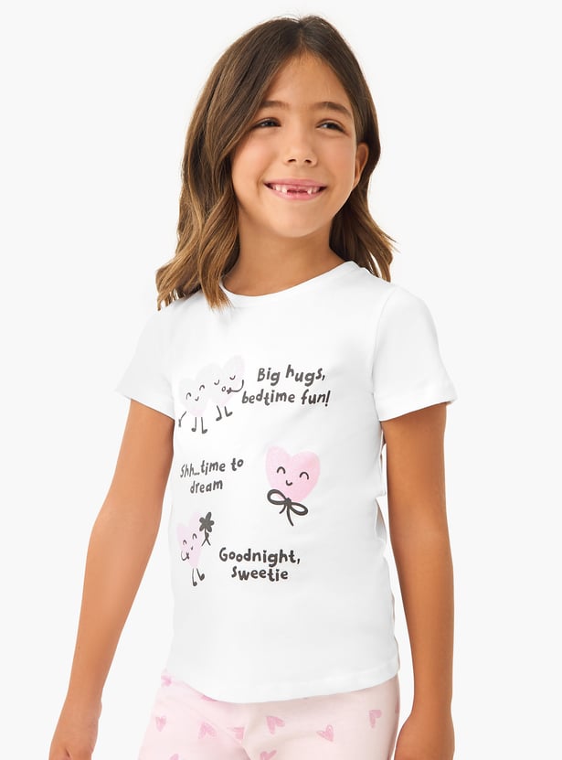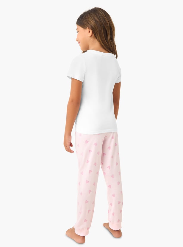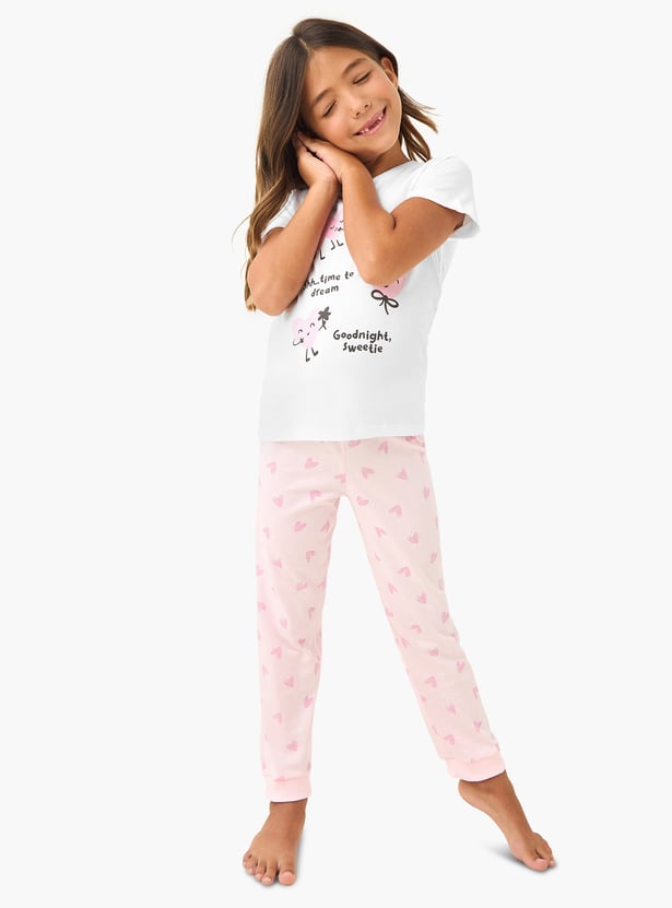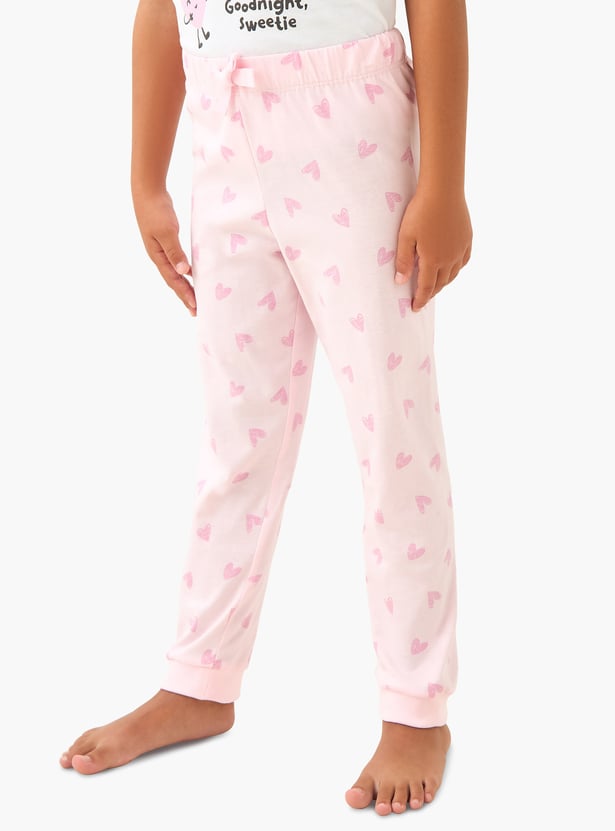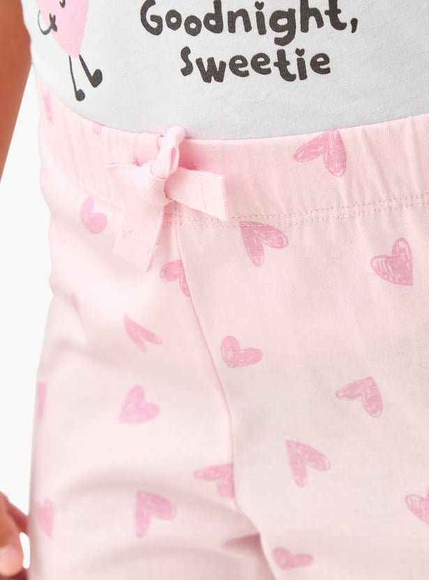 Make bedtime sweeter with this heart print t-shirt and pyjama set for toddler girls. The soft, breathable fabric keeps her cosy through the night. The cute heart motifs add a playful touch to her sleepwear. Designed for comfort and easy movement. A delightful set for dreamy nights and cuddly mornings.
