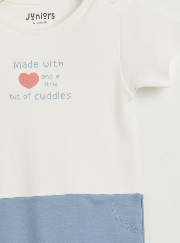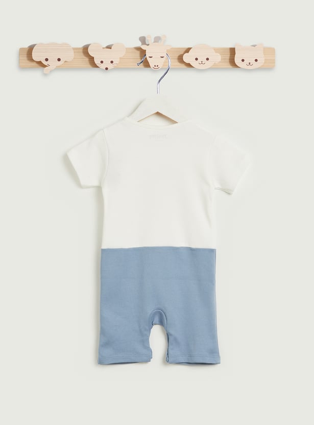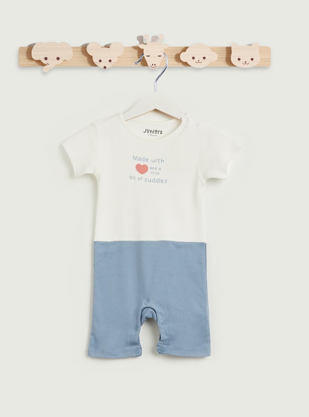 Wrapped in soft shades and sweet little details, the Juniors printed romper is made for cozy cuddles and happy wiggles. Designed with a comfortable crew neckline and short sleeves, the contrast lower panel adds a cute visual touch, while the snap button closure at the bottom makes dressing and diaper changes quick and fuss-free. Perfect for everyday wear, this romper balances comfort with adorable style. Made from soft, breathable fabric that feels gentle on delicate skin and allows easy movement all day.