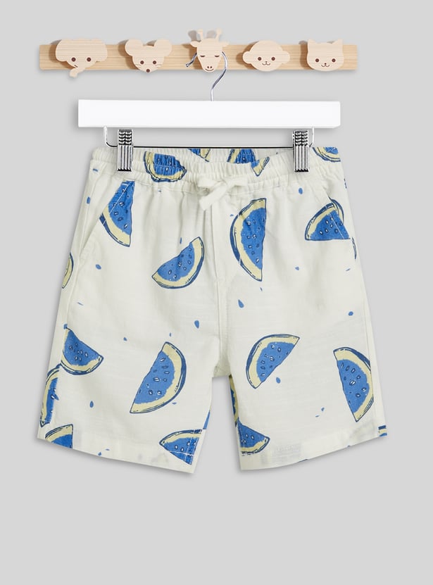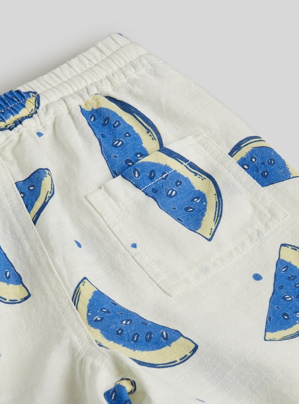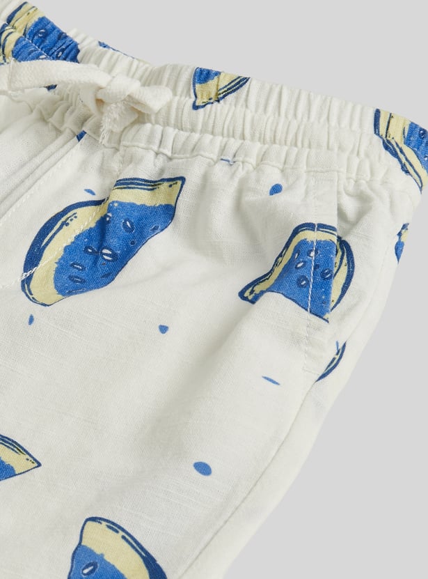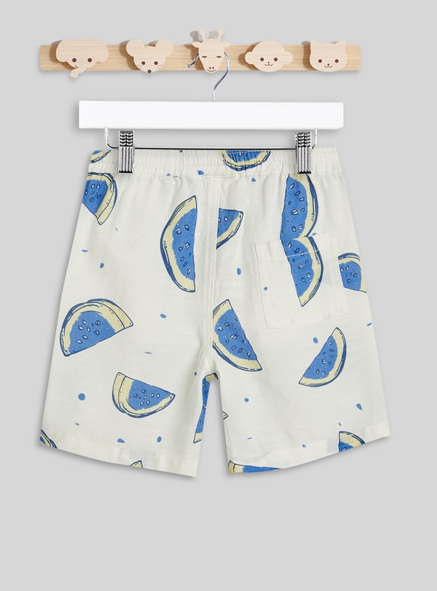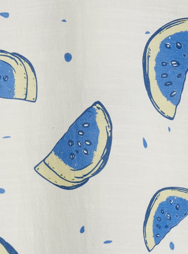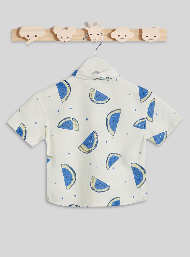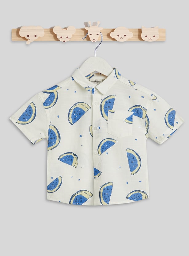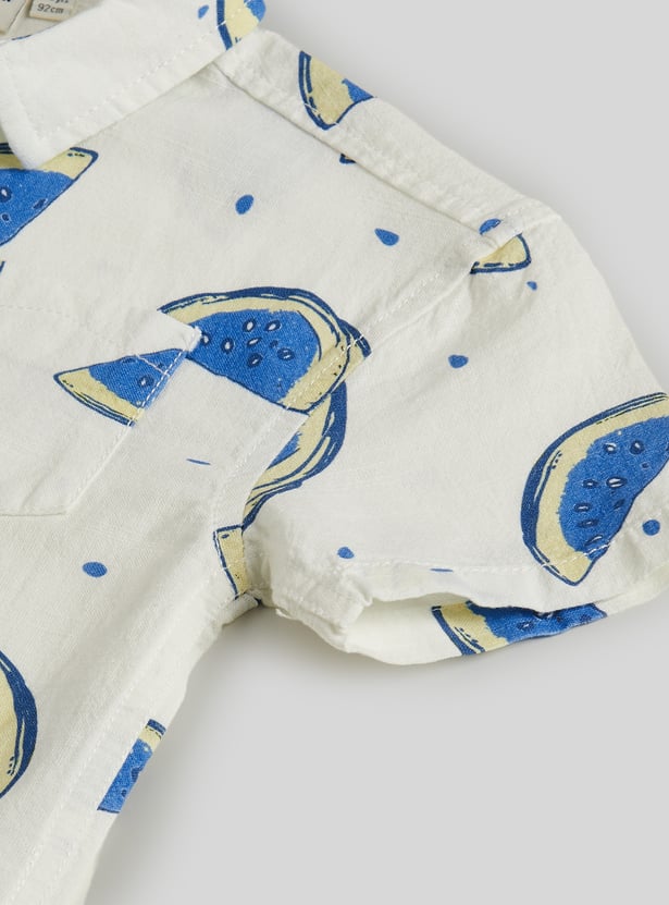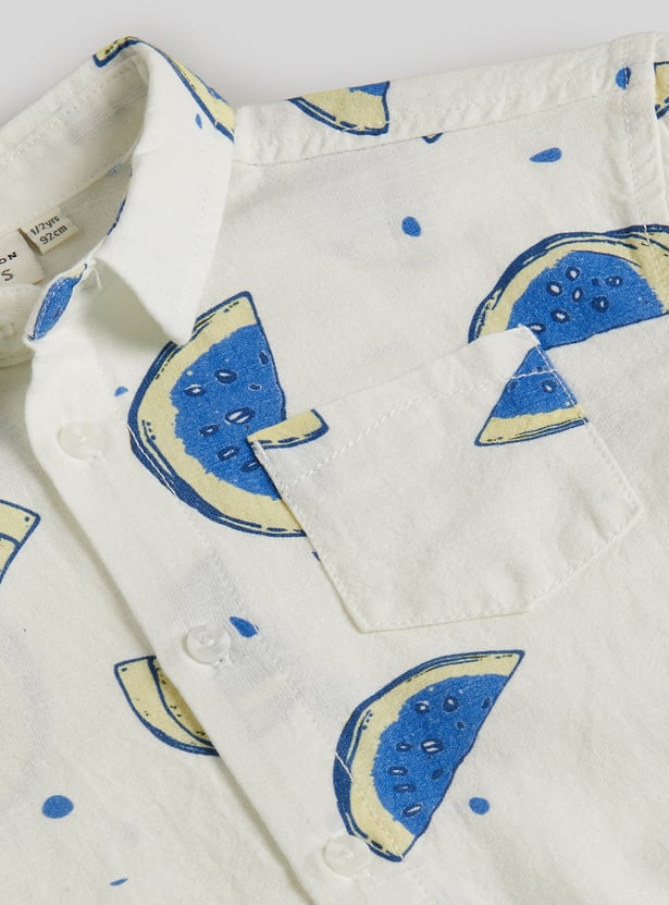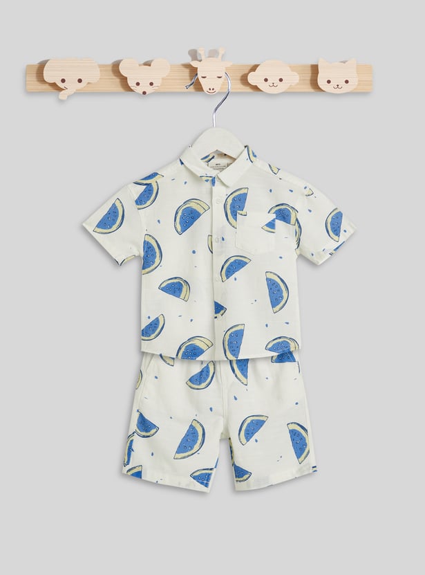 This printed shirt and shorts set offers a smart yet playful look for little ones. The shirt features a spread collar, half sleeves, and a patch pocket, while the shorts are designed with a drawstring waist and cross pockets for a comfortable fit. Adorned with all-over prints and crafted from soft fabric, the set ensures ease of movement and everyday comfort.