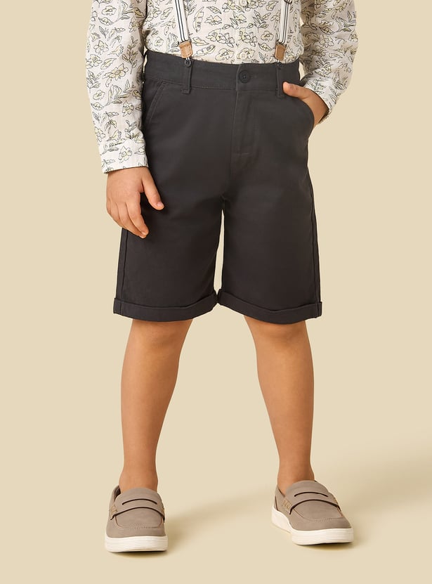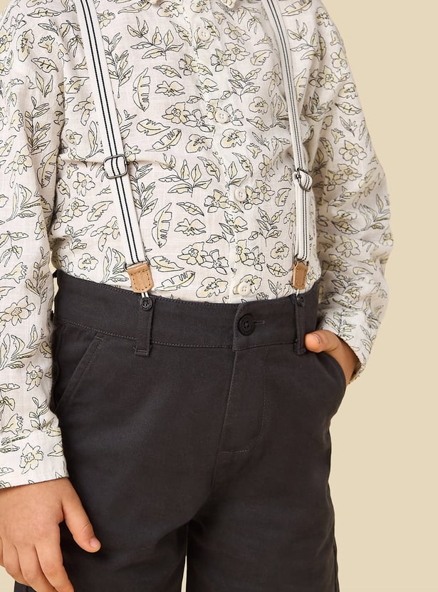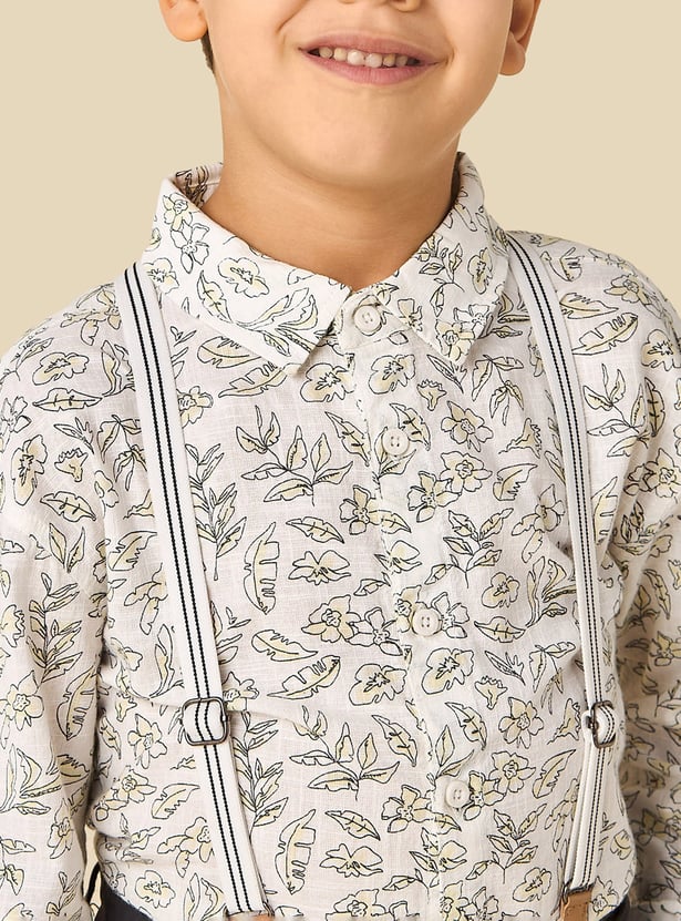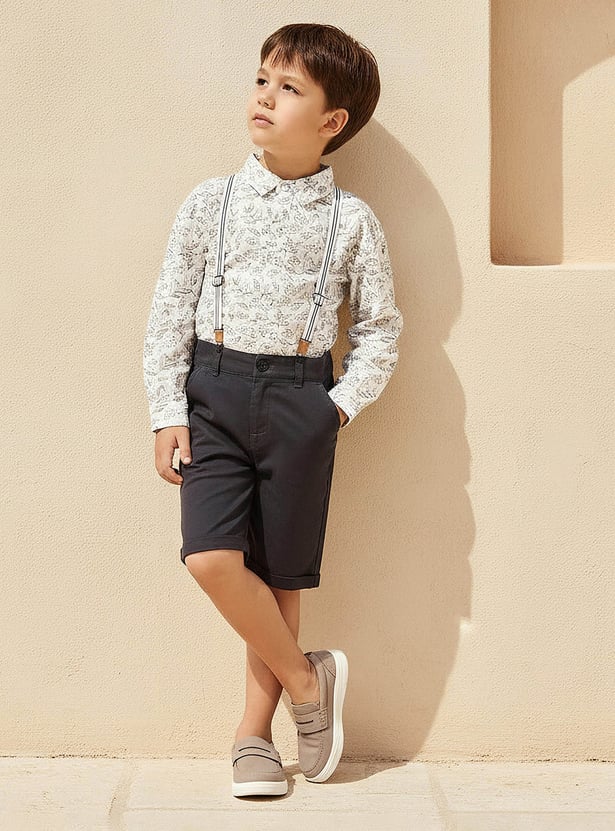 This charming three-piece boys' outfit features a long-sleeved printed shirt paired with comfortable shorts and detachable suspenders. The shirt showcases a delightful all-over print, adding a playful touch to this ensemble. This set provides a complete and coordinated look, ensuring your child remains stylish and comfortable for various occasions.