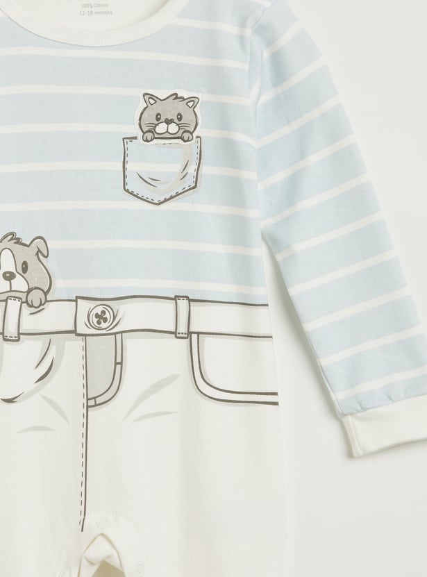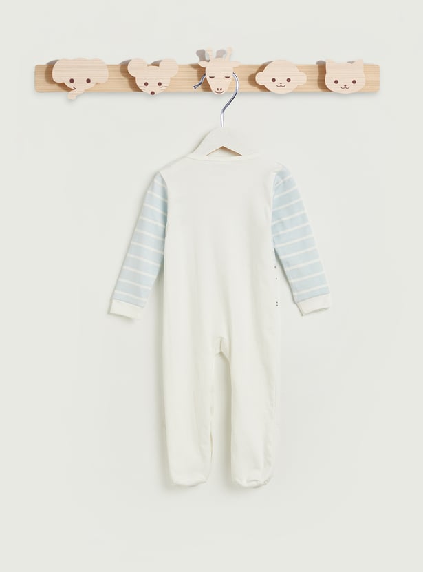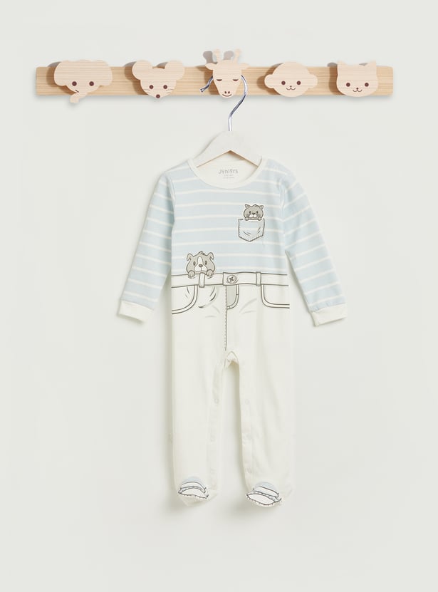 Wrap your little one in sweet dreams and soft cuddles with this charming printed sleepsuit. Featuring a crew neckline, full sleeves, and a button-front closure for easy dressing, it offers a comfy fit with full-length legs. Crafted from soft, breathable fabric that’s gentle on baby’s skin.