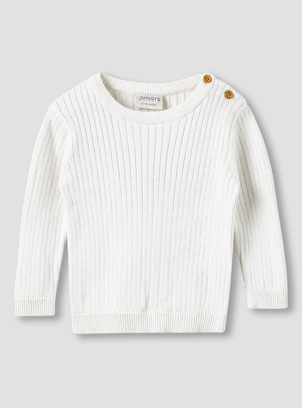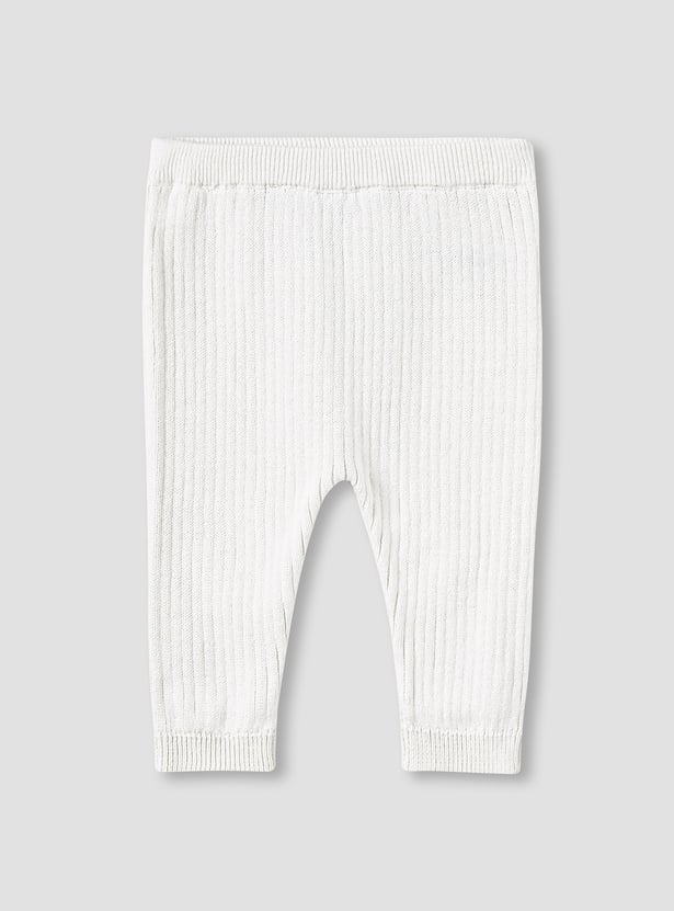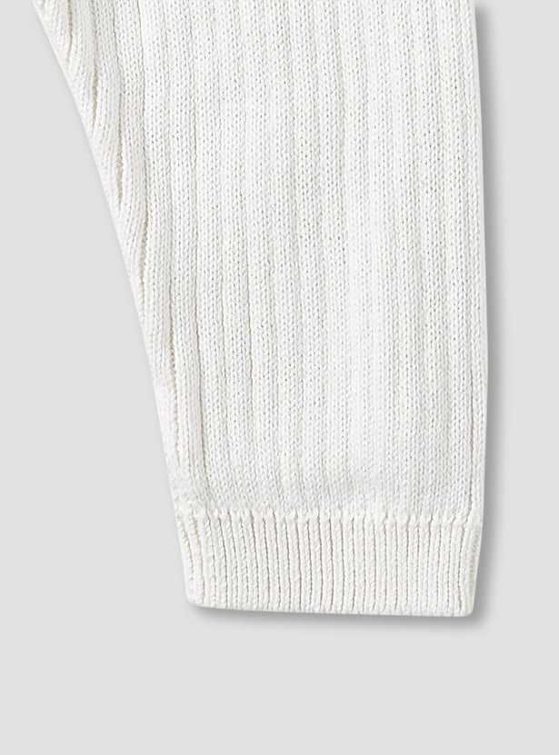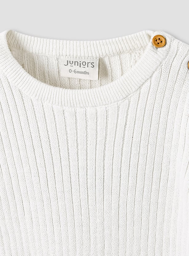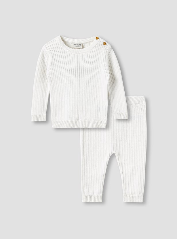 Discover this charming ribbed knit pyjama set, designed for ultimate comfort and warmth. The two-piece ensemble includes a long-sleeved t-shirt with practical shoulder buttons for effortless dressing and coordinating trousers with an elasticated waist. Crafted from soft knitwear, this set ensures your little one stays cosy throughout the day and night. Perfect for restful sleep or comfortable play, this pyjama set combines style with practicality.