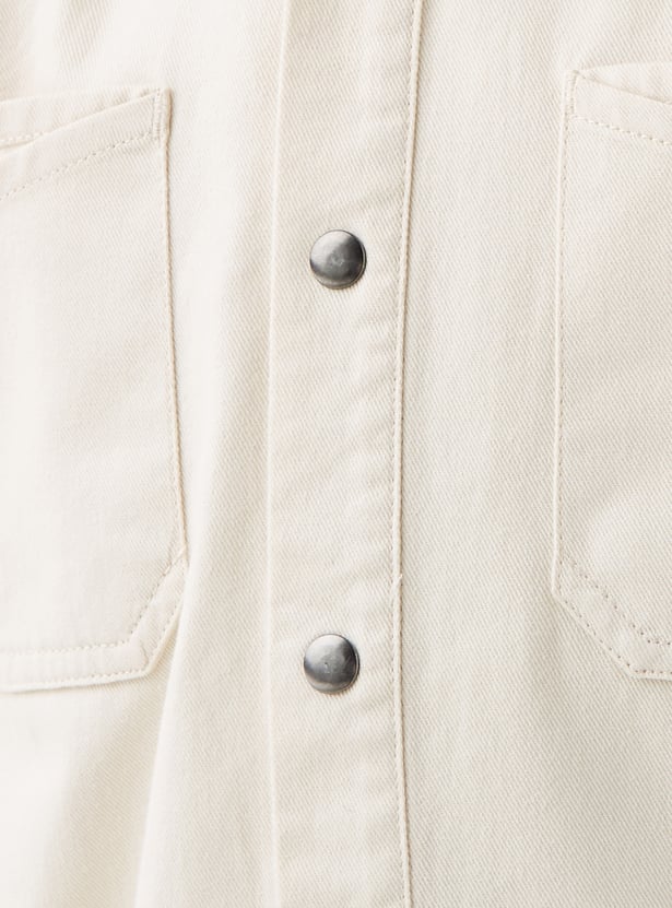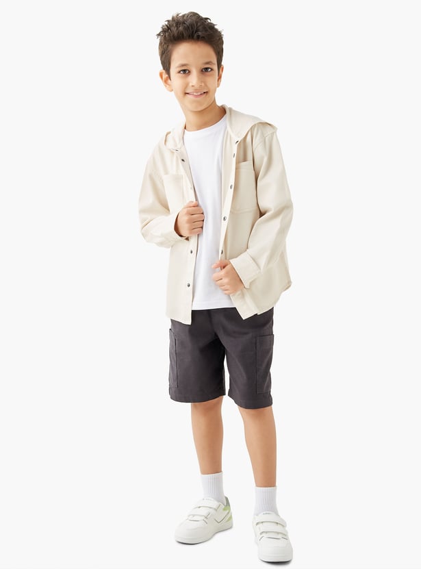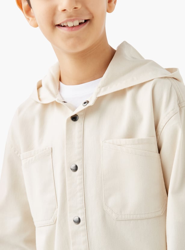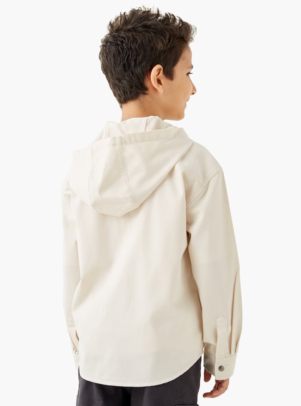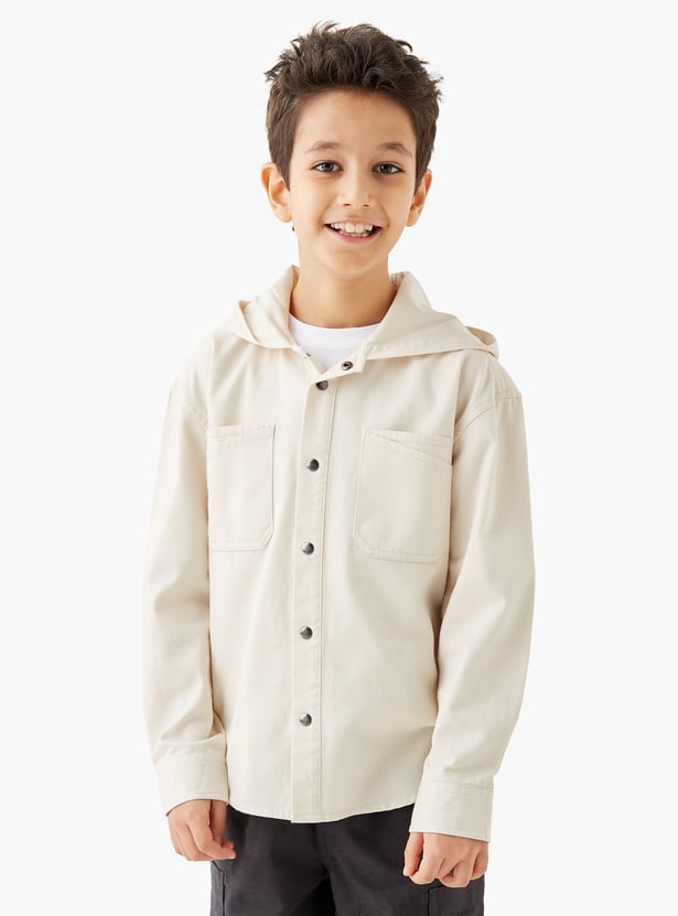 This hooded shirt offers a stylish and practical addition to his wardrobe. The comfortable design features a convenient hood and two chest pockets, full sleeves, adding a touch of casual style. This versatile shirt is perfect for layering or wearing on its own, making it ideal for various occasions.
