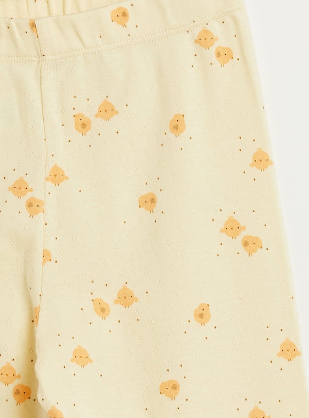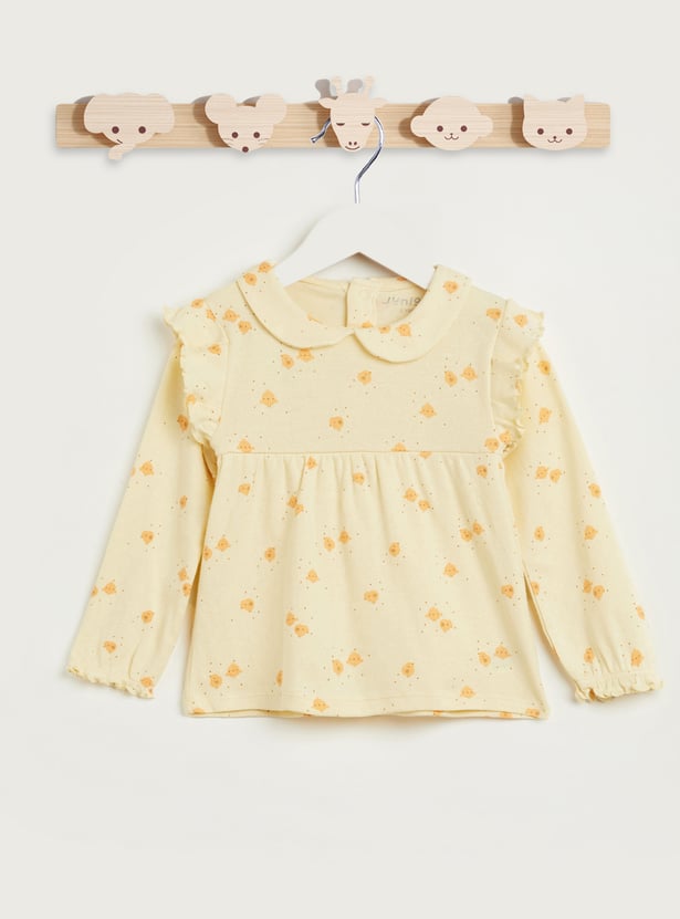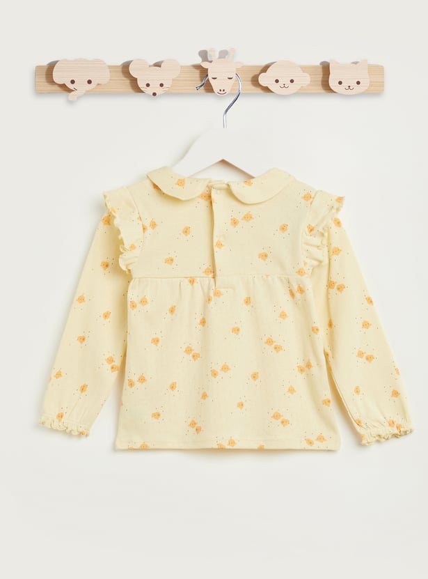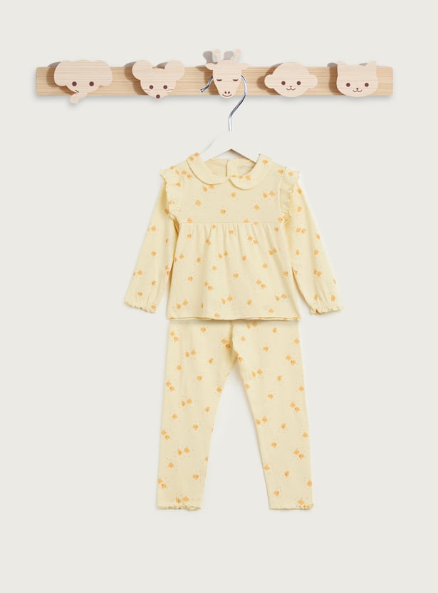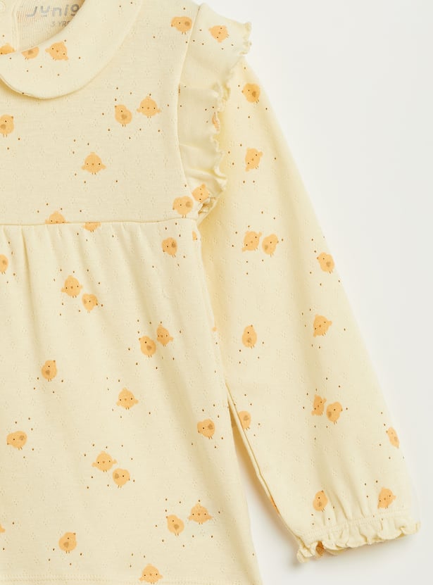 Sprinkle everyday moments with soft charm in this adorable bird print t-shirt and pyjama set. The top features a sweet Peter Pan collar with long sleeves and a gently flared silhouette, while the pyjamas come with a comfortable elasticated waist for easy movement. Designed for effortless wear, it’s perfect for playtime, lounging, or bedtime cuddles. Made from soft, breathable fabric for gentle comfort on young skin.