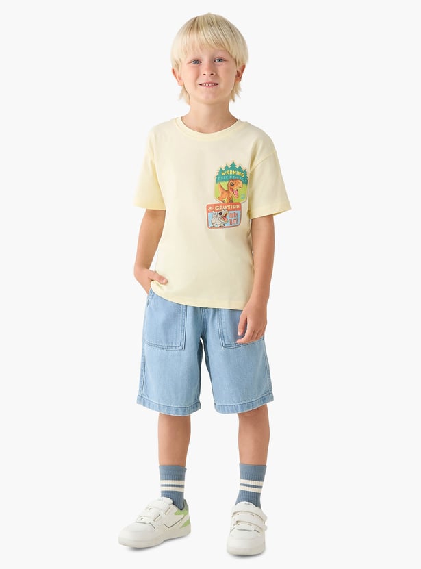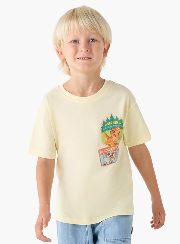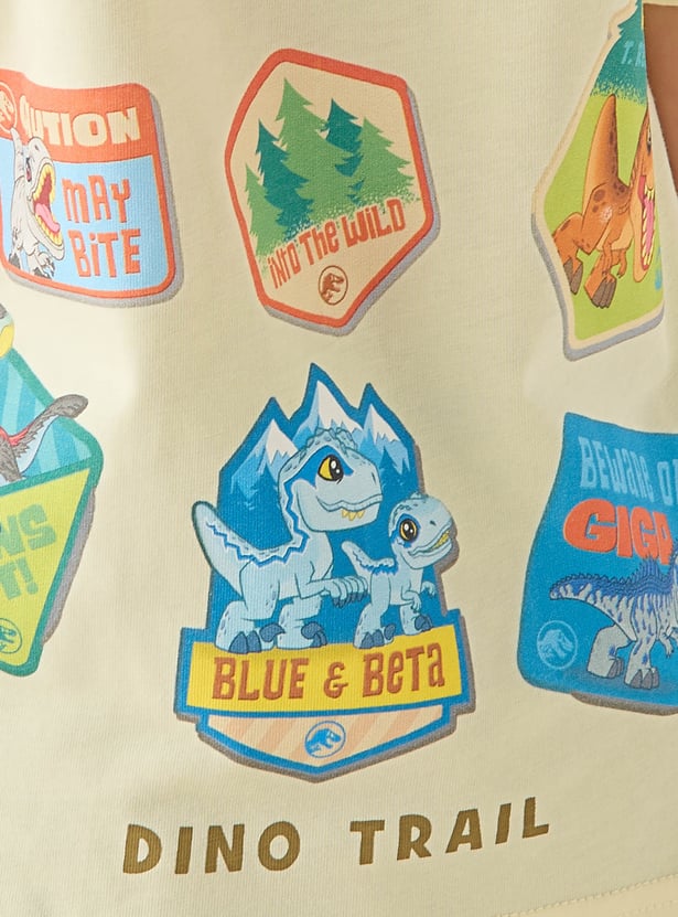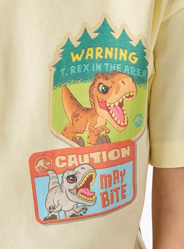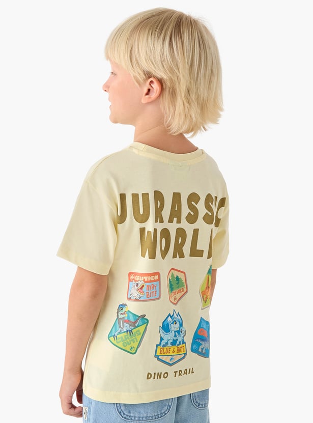 Perfect for young dinosaur enthusiasts, this T-shirt is highlighted with Jurassic World-themed prints on the chest and back. It features a crew neck and half sleeves. It is crafted from soft, breathable fabric for all-day comfort.