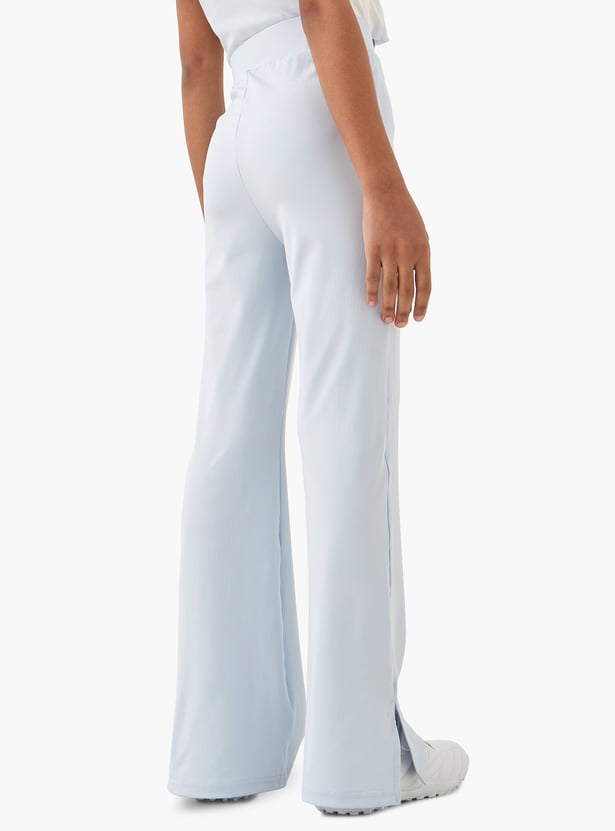 Elevate your daughter's wardrobe with these stylish leggings. Crafted from quality fabric, they offer a soft and comfortable feel, perfect for everyday wear. The solid tone adds versatility, allowing easy pairing with various tops. The flared design provides ease of movement and a fashionable touch. These leggings are finished with an elasticated waistband for a snug fit.