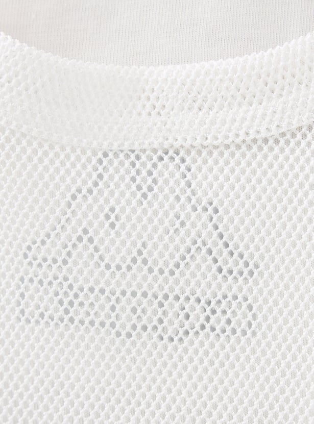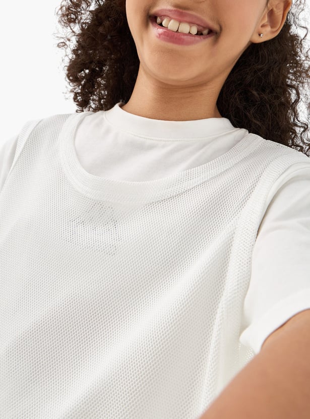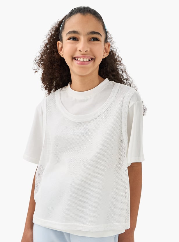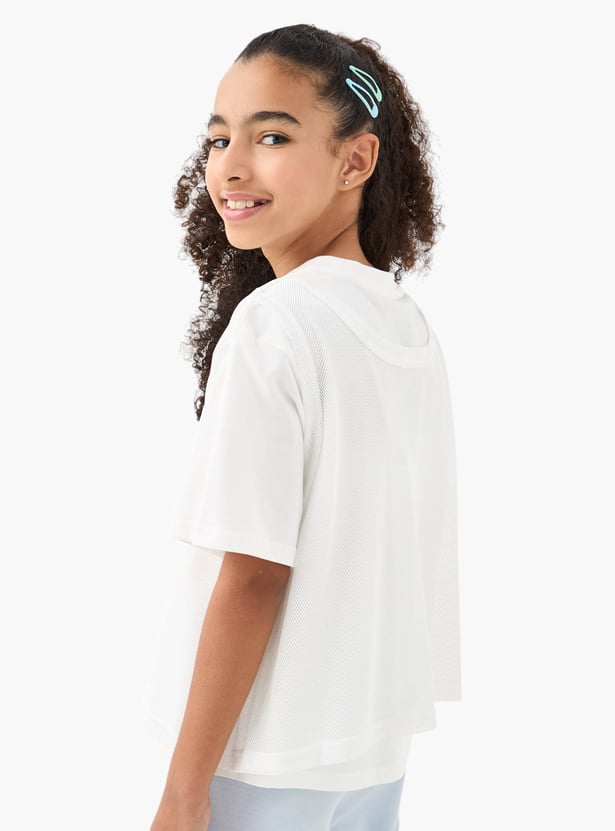 This stylish t-shirt is perfect for young girls, combining comfort and a classic look. Featuring a sporty pattern and round neck, it pairs effortlessly with a variety of pants. The short sleeves provide ease of movement, while the mesh layering enhances visual appeal. This t-shirt is a fashionable choice for her wardrobe.