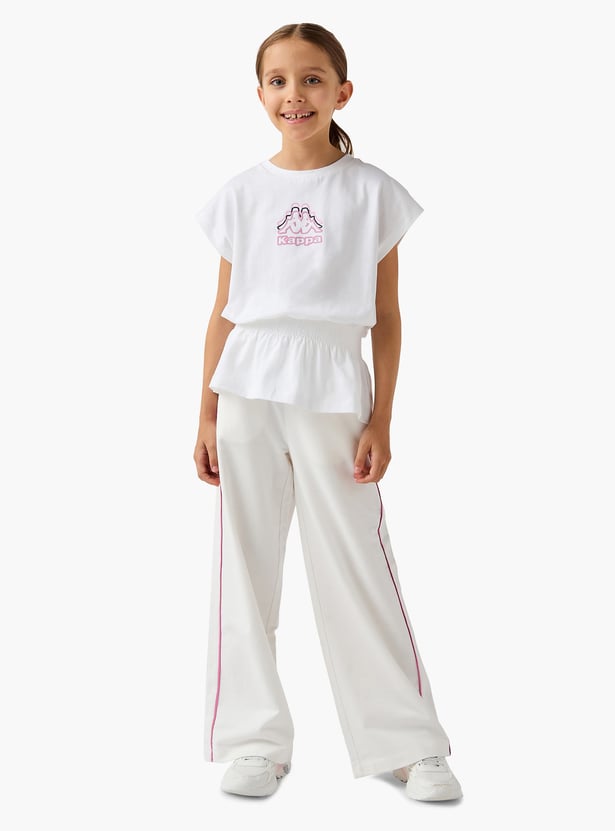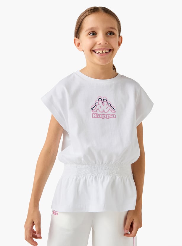 This t-shirt offers a stylish and comfortable fit for everyday wear. The smocked detail waist design creates a flattering silhouette, while the short sleeves and round neckline provide a classic look. The eye-catching graphic adds a touch of personality to her wardrobe.