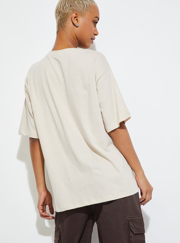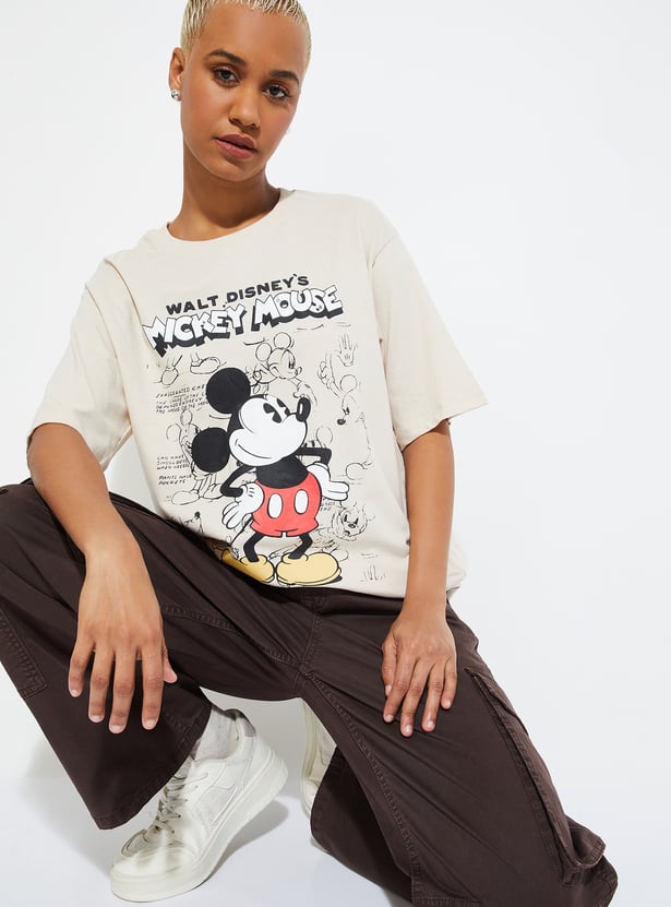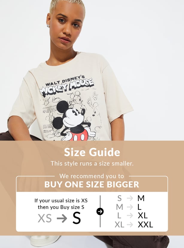 Playful and comfy, this oversized T-shirt features a fun Mickey Mouse print that adds a cheerful touch. Designed with a classic round neckline and relaxed half sleeves, it offers a laid-back fit perfect for casual days.