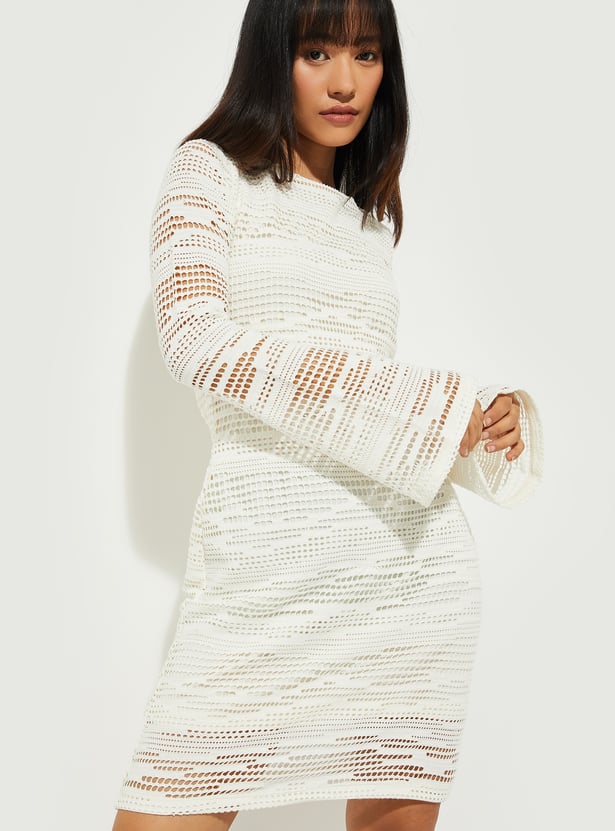 This crochet straight dress features intricate crochet detailing, a lined interior for comfort, and a tie-up back for a customizable fit. The full sleeves and boat neck create a refined, elegant silhouette.