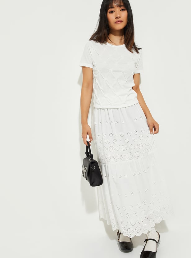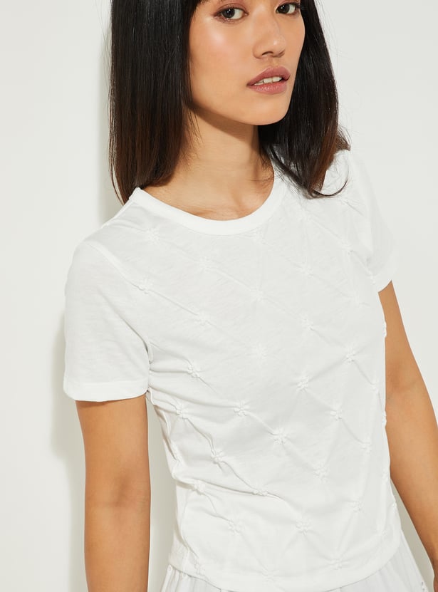 Add a touch of elegance to your wardrobe with this embroidered top. Featuring a classic round neck and half sleeves, the intricate embroidery adds a refined charm to its simple silhouette.