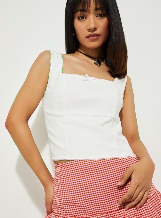 This fitted corset top features a square neck, sleeveless design, and a cropped fit, creating a sleek, structured silhouette. The corset style adds a touch of edginess, while the square neck offers a modern, flattering neckline.