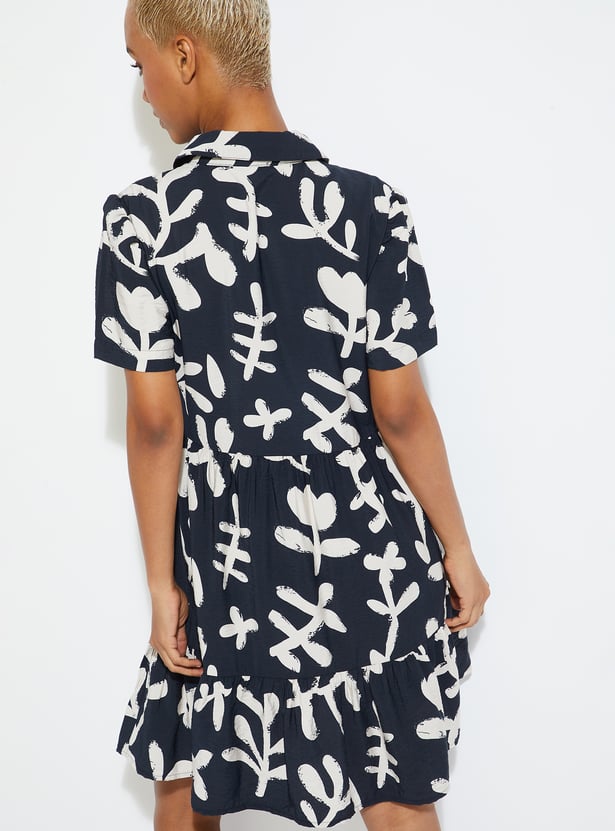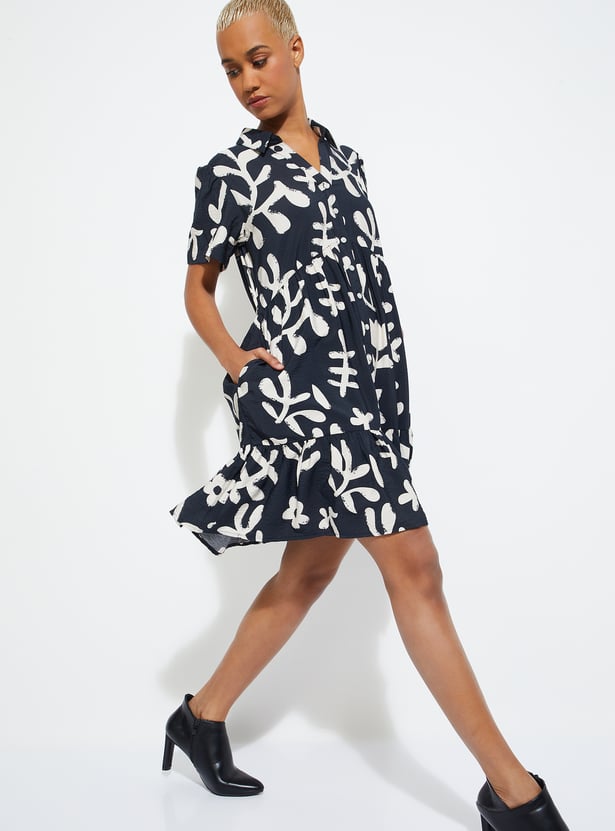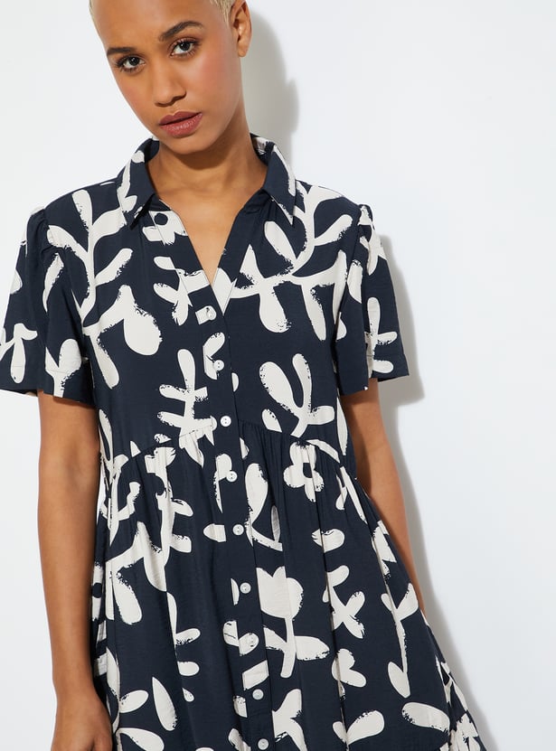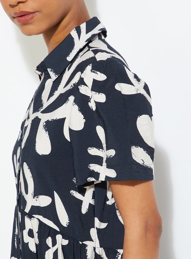 This printed fit & flare shirt dress features a spread collar neckline, button-down front, and half sleeves for a refined yet relaxed silhouette. The tiered construction adds movement while keeping the look effortlessly polished.
