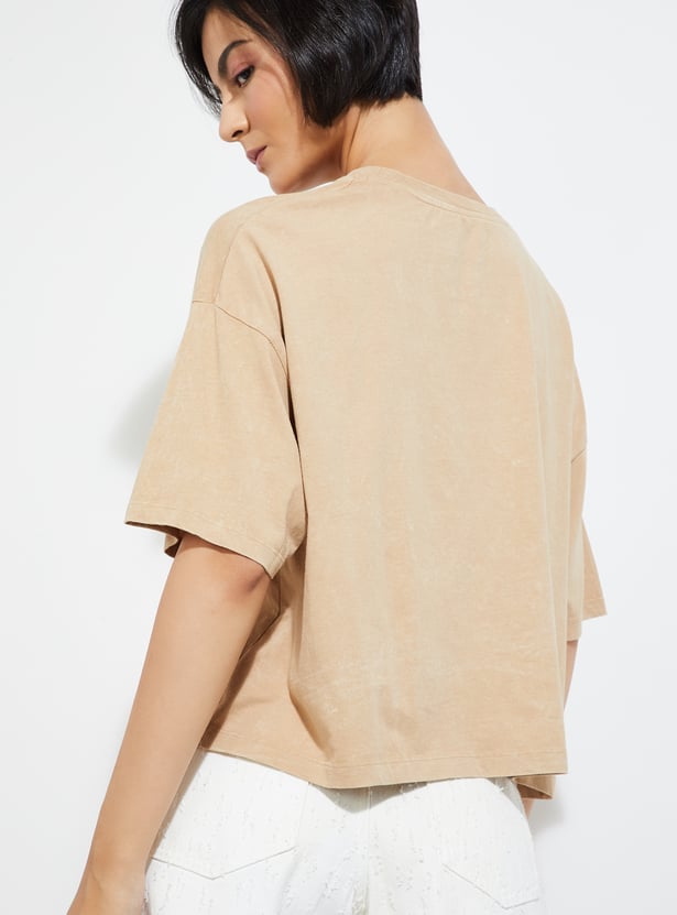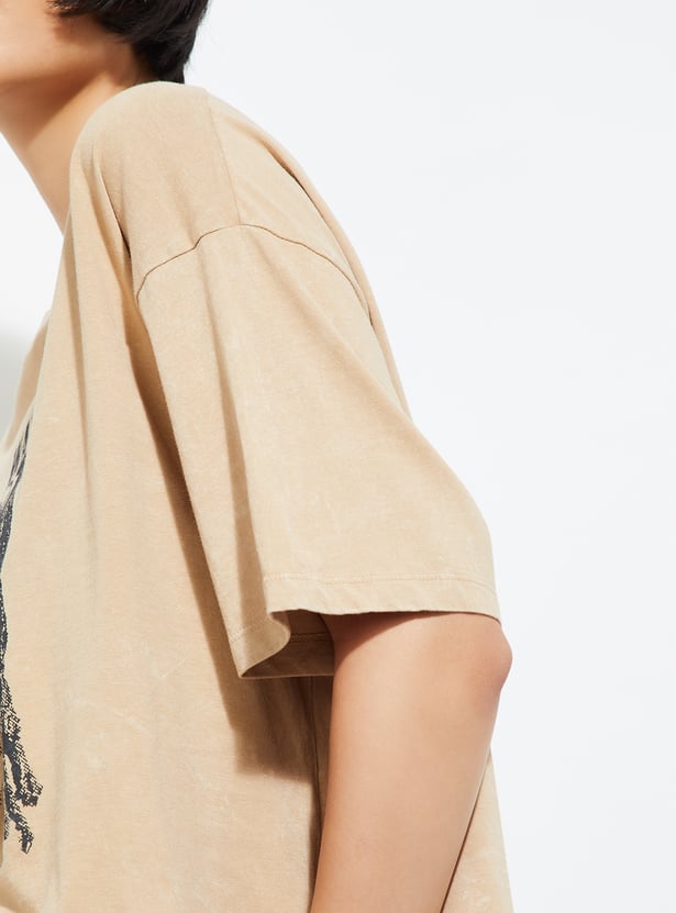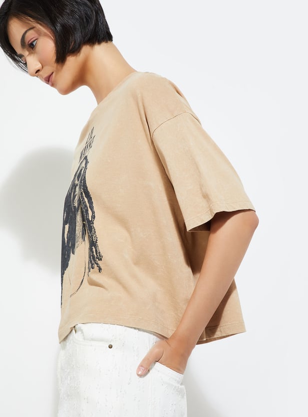 Stay comfortable and cool in this printed T-shirt, featuring a classic round neck and half sleeves. Perfect for casual days with a touch of personality.