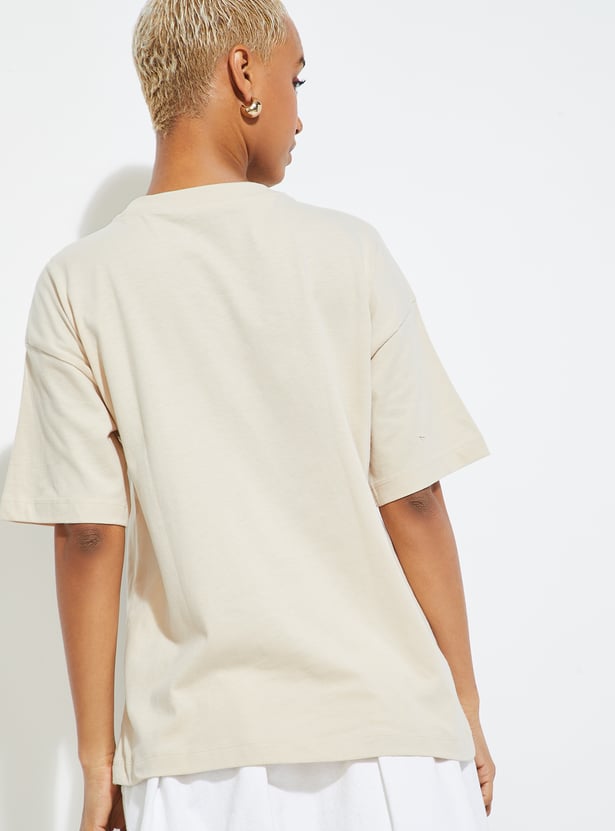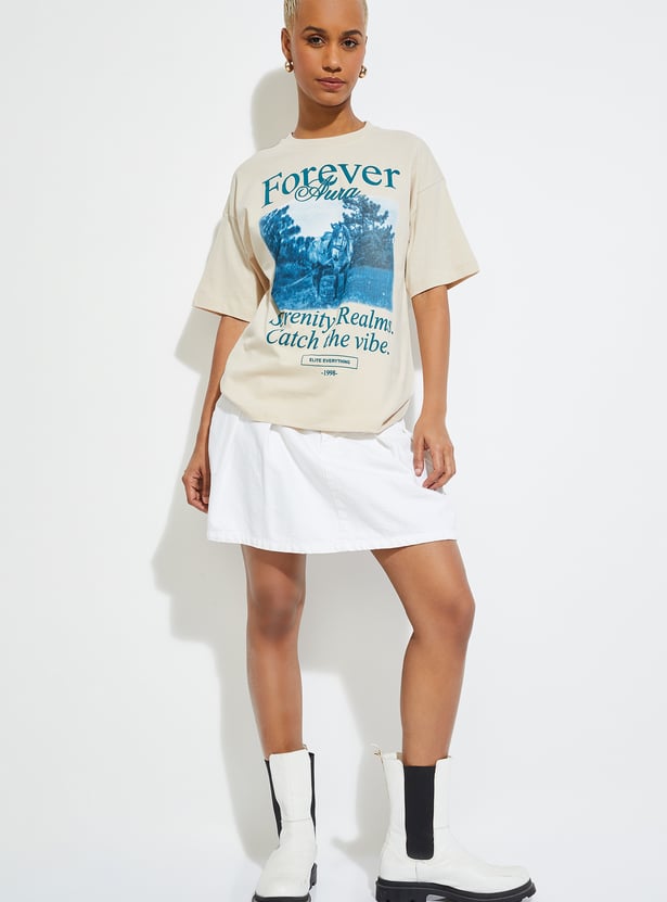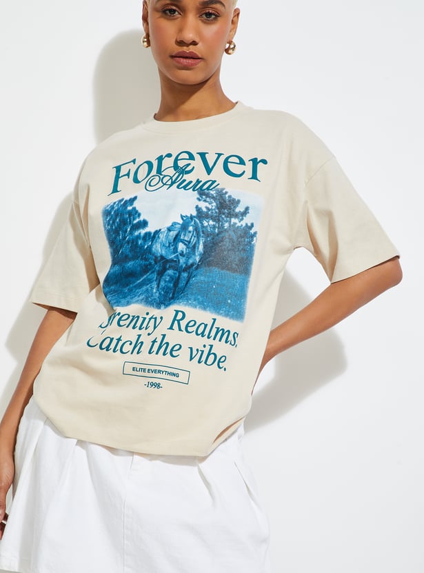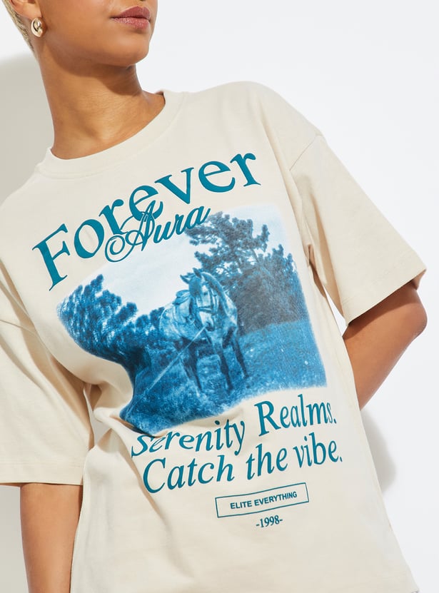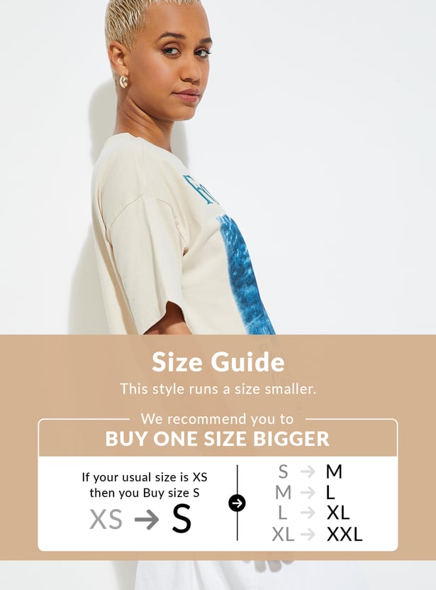 This graphic printed T-shirt is designed with a classic round neckline and easy half sleeves for a relaxed everyday silhouette. The print brings a fresh visual lift, making it an effortless wardrobe staple.