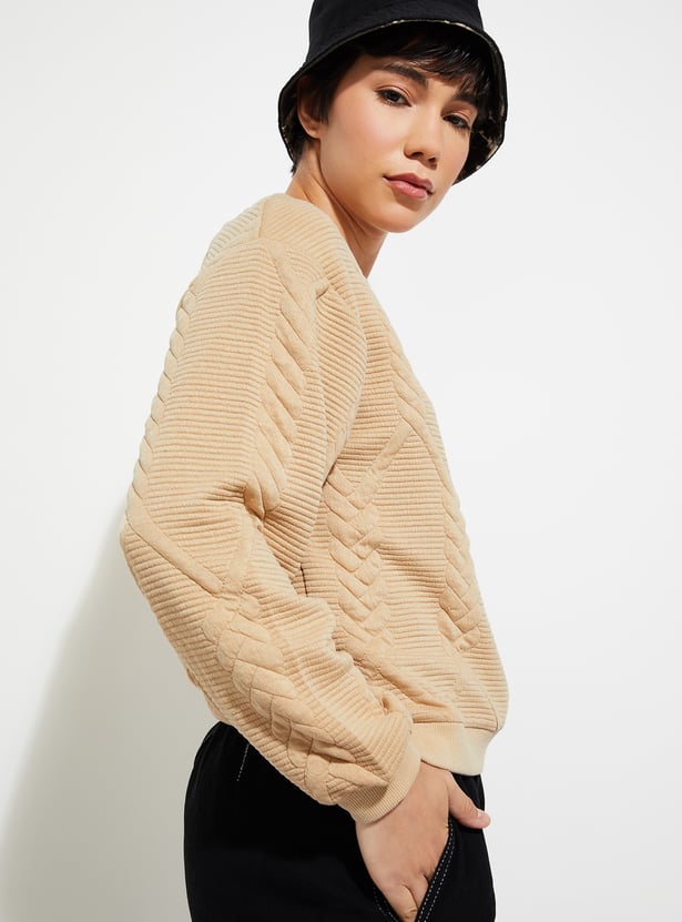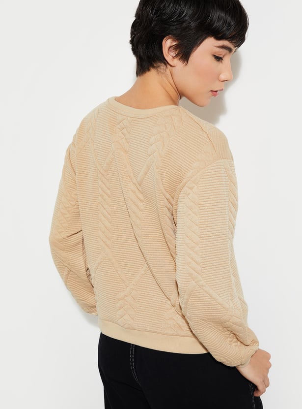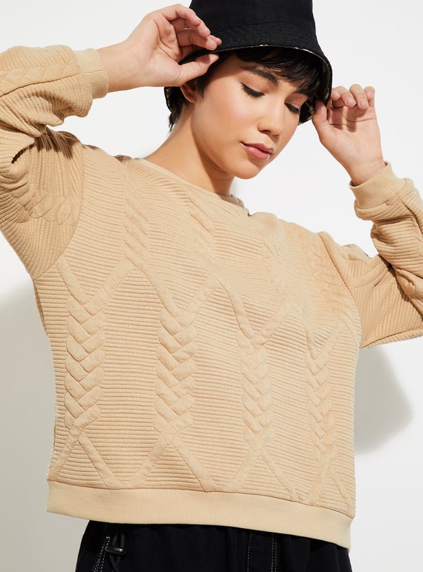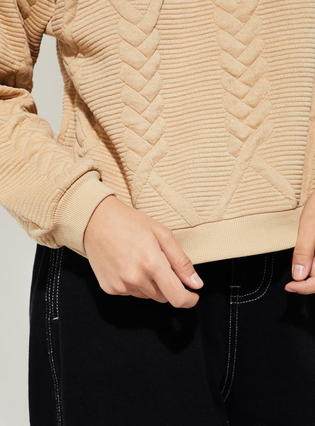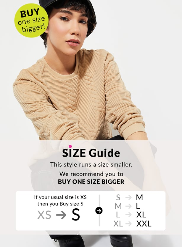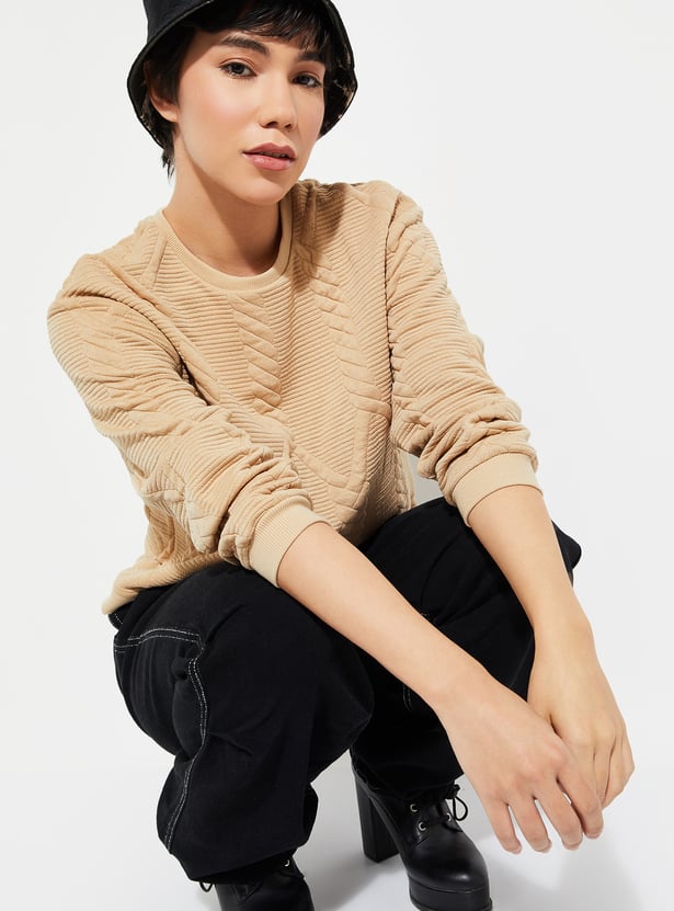 Stay cosy and chic with this sweatshirt. Featuring a classic round neck and full sleeves, this sweatshirt is designed with a ribbed hem for a snug fit. The quilted texture adds a stylish twist, making it a perfect choice for both comfort and warmth.