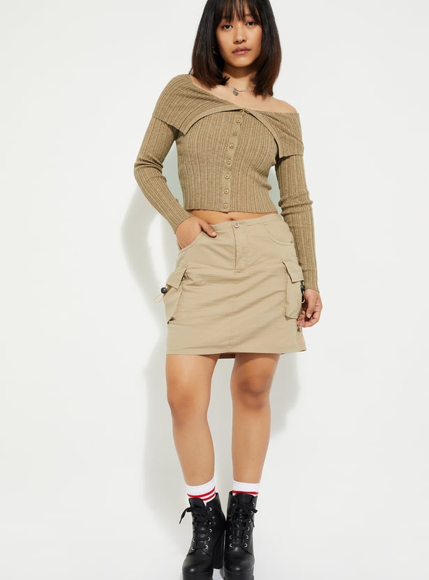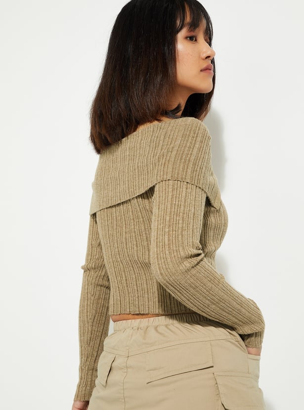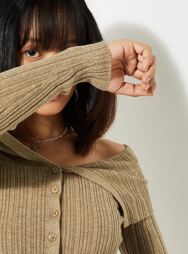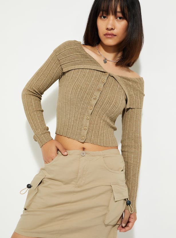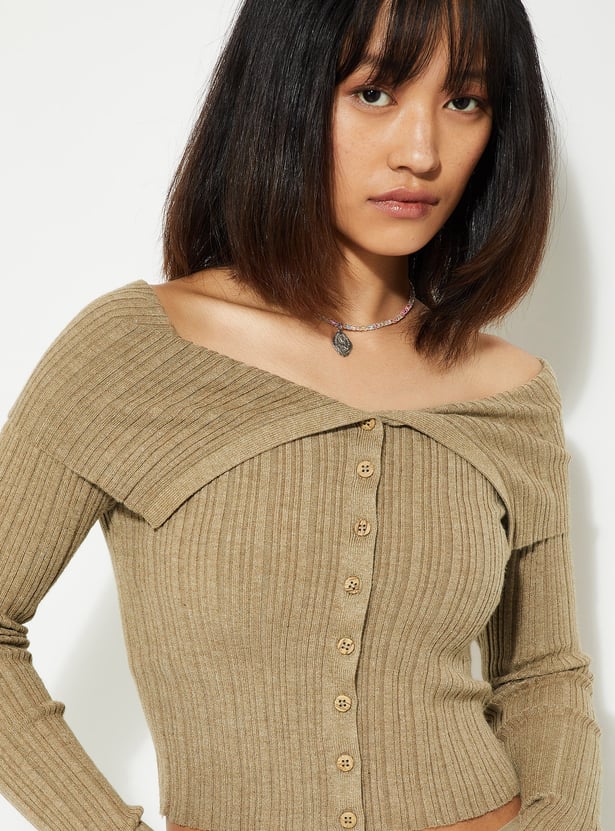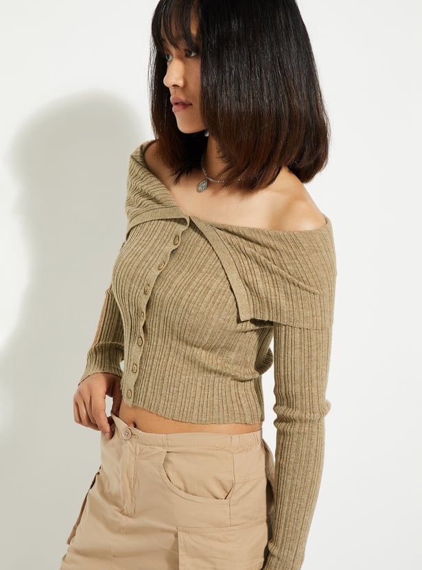 Step up your urban style with this chic crop top. Its off-shoulder neckline and full sleeves with button closures exude sophistication, while the ribbed texture adds a touch of modern flair and ensures a comfortable fit.