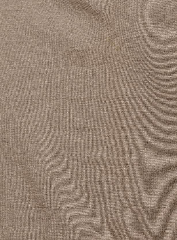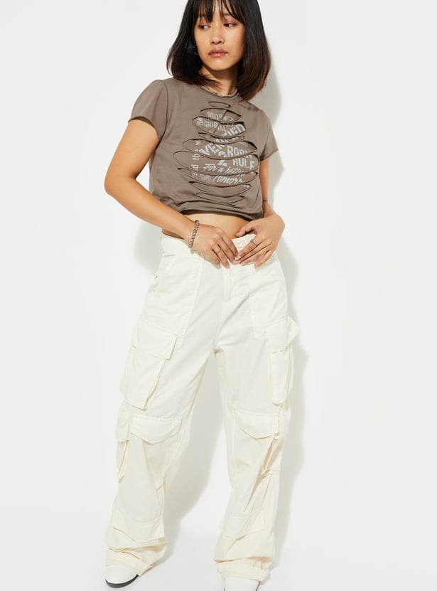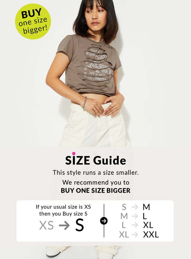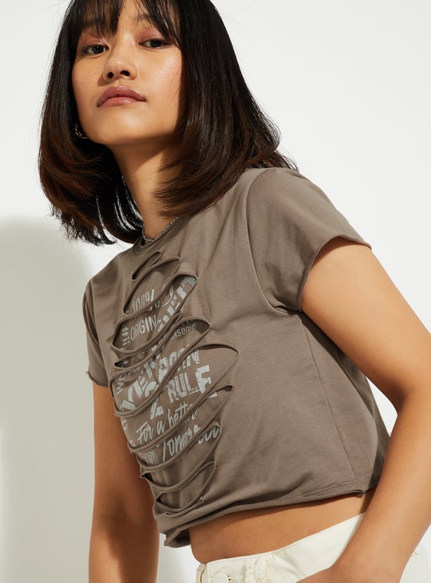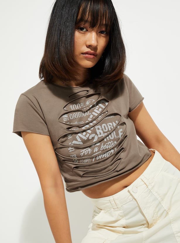 Build your basic wardrobe with this cropped top, designed with a round neck, half sleeves, and a printed pattern accented with ribbed detailing for added style and comfort.