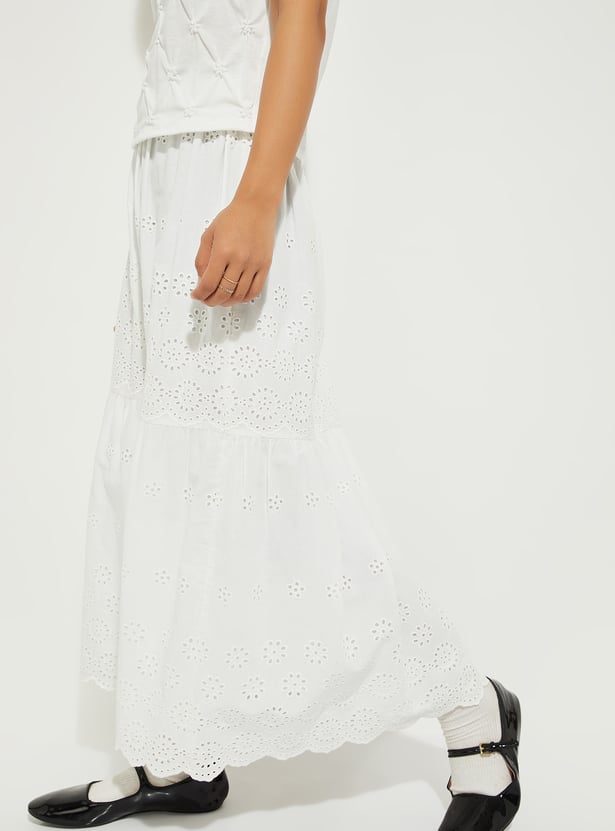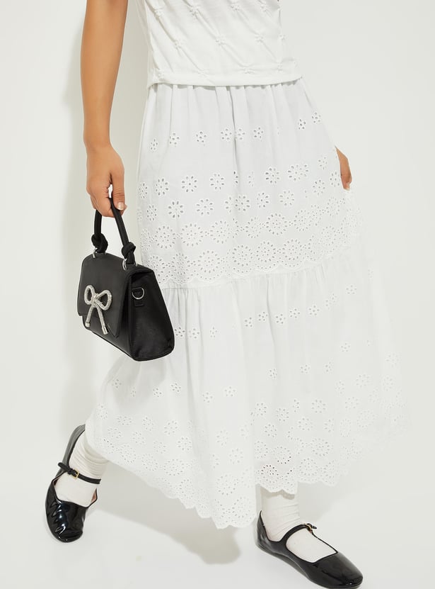 This schiffili embroidered long tiered skirt features delicate embroidery for a textured, elegant look and an elasticated waist for comfort and a flattering fit. The flowing design adds a graceful, feminine touch to your outfit.