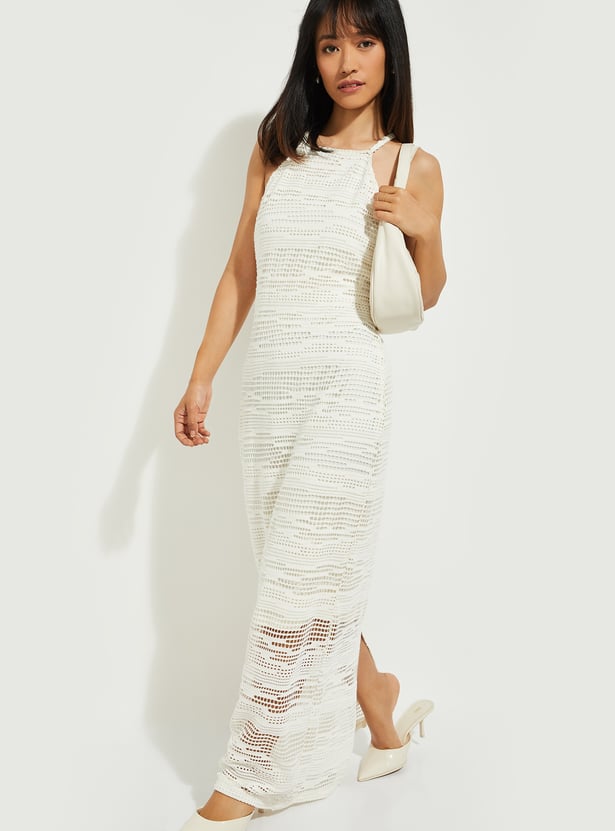 This schiffili maxi dress features a halter neck and a cross-strap back, creating a sleek and elegant silhouette. The delicate fabric adds texture, while the lined design ensures comfort and coverage.