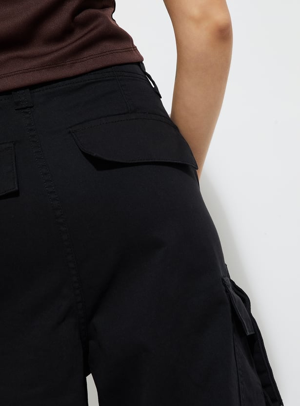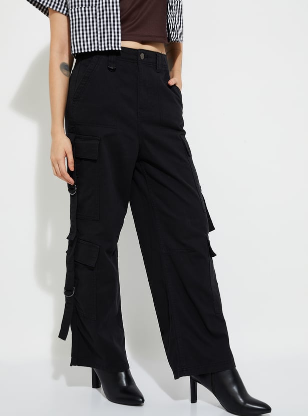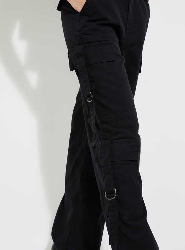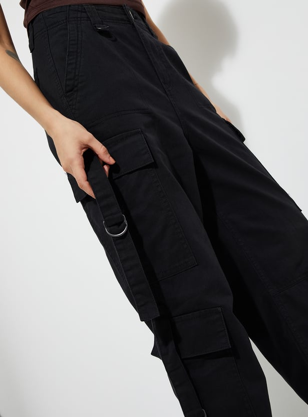 These solid cargo trousers combine functionality with casual edge, making them a versatile wardrobe staple. Designed with a low-rise fit, button closure, belt loops, and multiple pockets, they offer both style and utility for everyday wear.