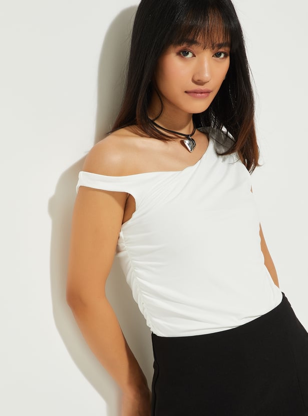 Turn heads with this chic one-shoulder crop top. Featuring a solid design and cinched sides, it creates a flattering silhouette that’s perfect for a night out or a stylish casual look.