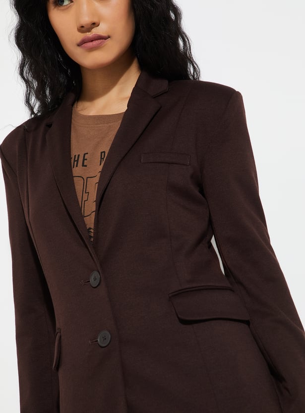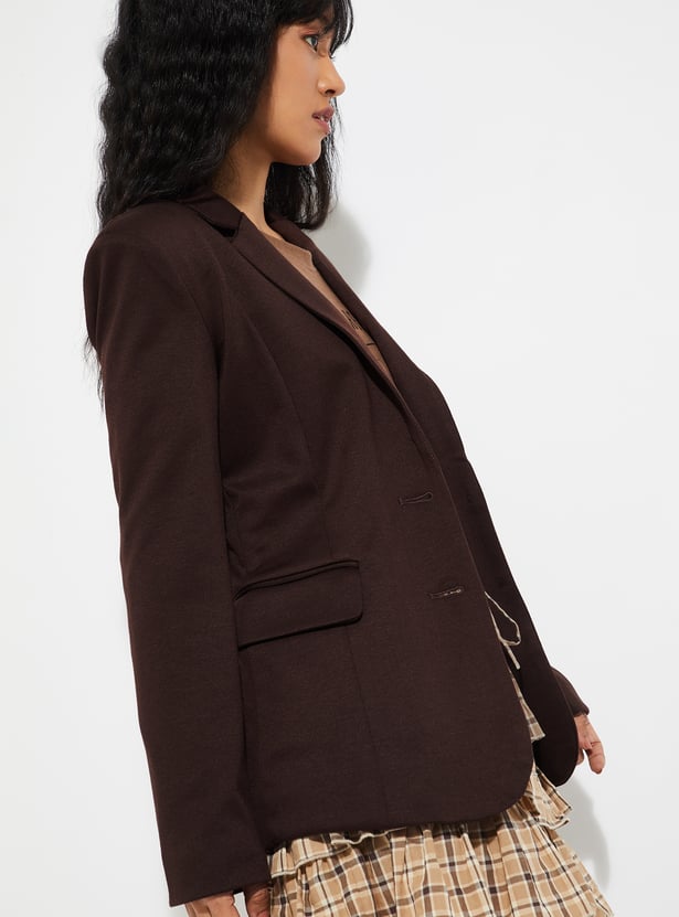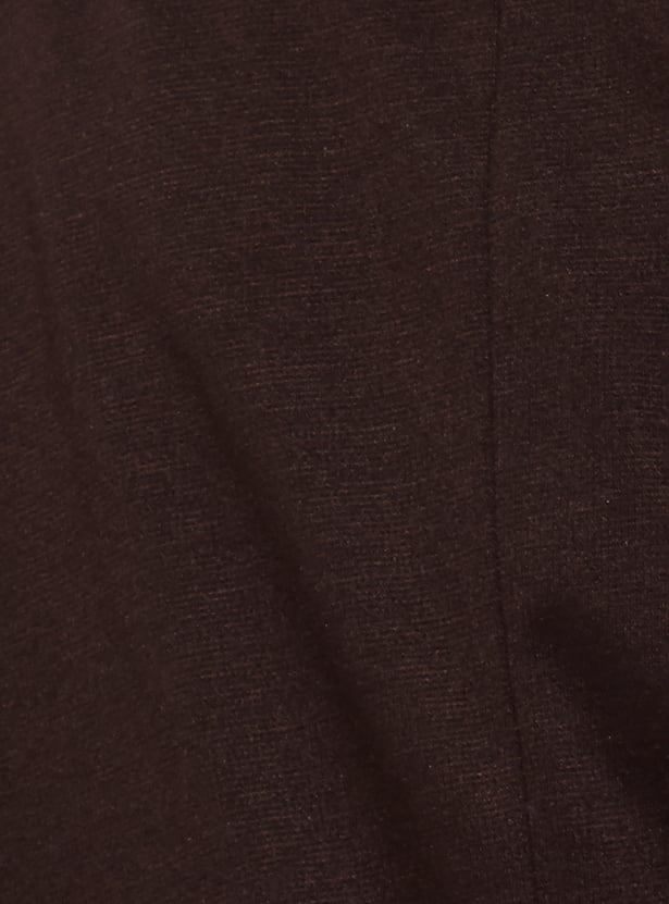Elevate your formal wardrobe with this textured regular fit blazer, featuring full sleeves, a notched lapel, button closure, and functional pockets for a sharp, polished look.
