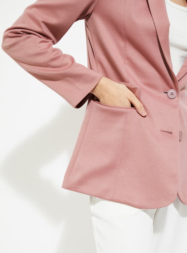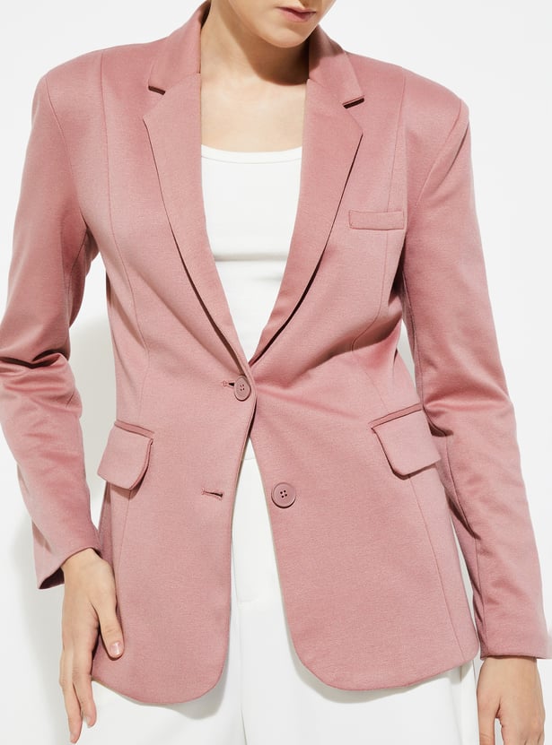 Elevate your formal wardrobe with this textured regular fit blazer, featuring full sleeves, a notched lapel, button closure, and functional pockets for a sharp, polished look.