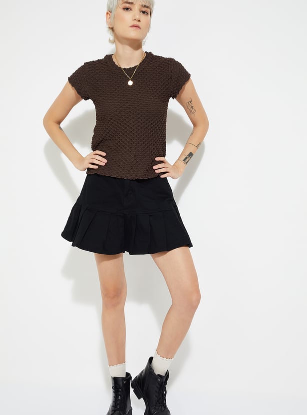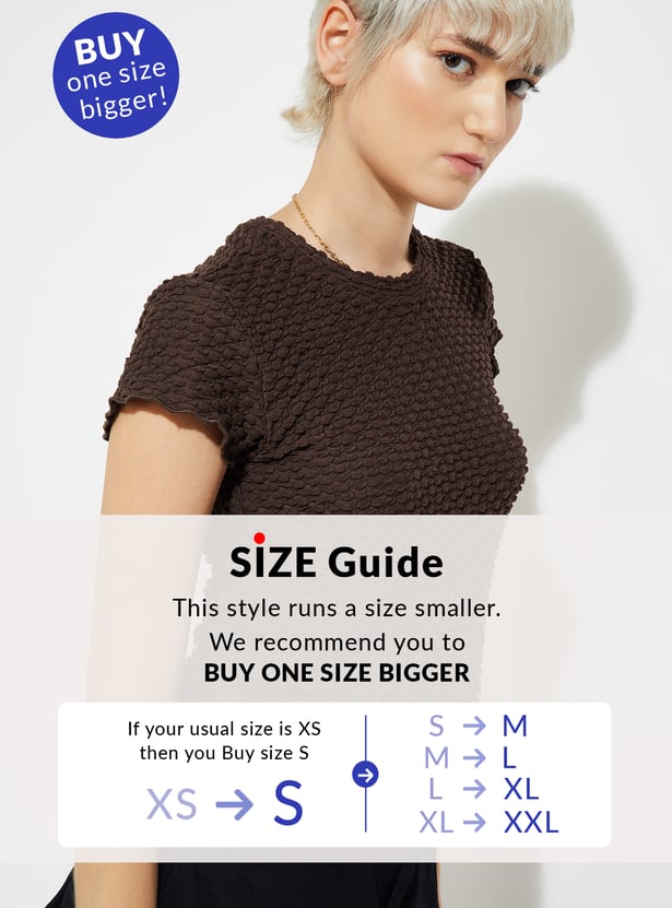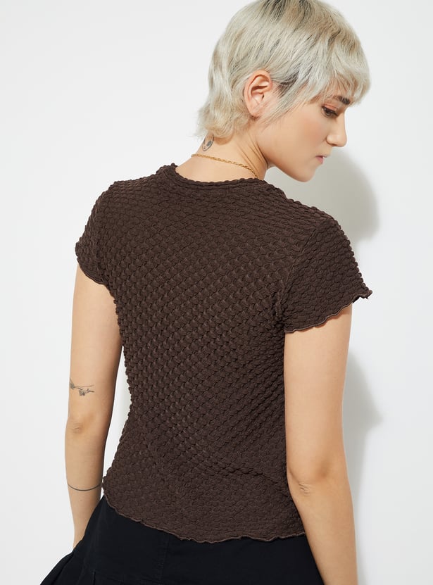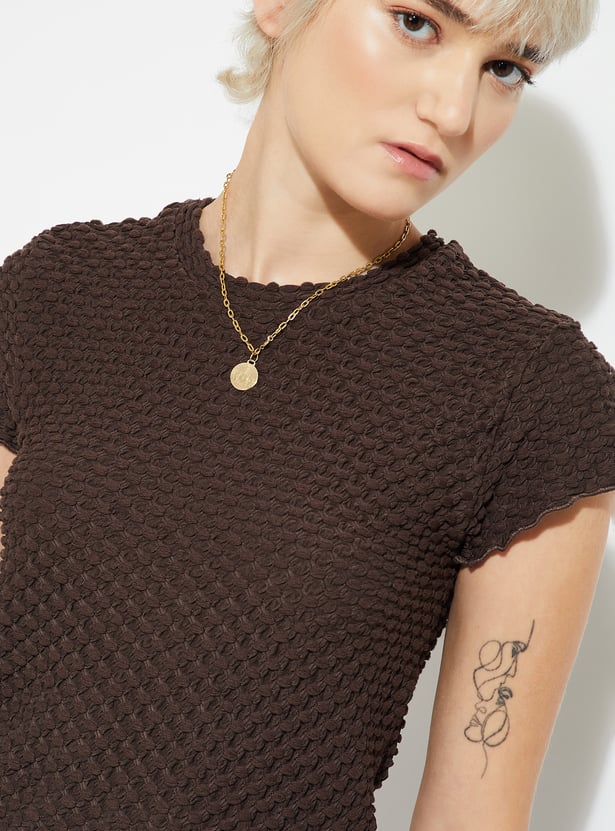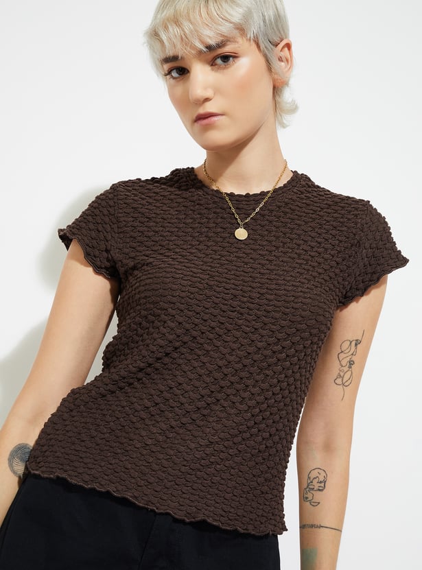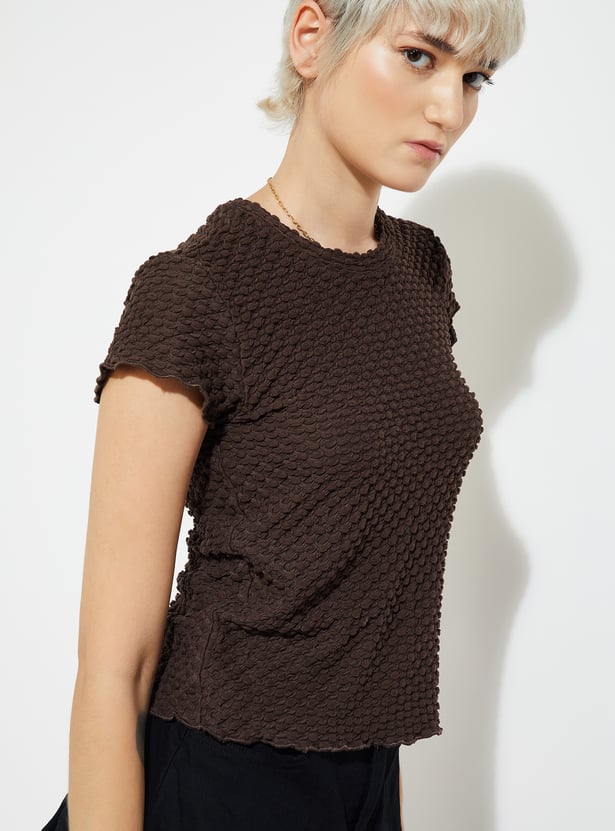 Elevate your everyday style with this textured top, featuring a classic round neck and half sleeves for a chic yet effortless look.