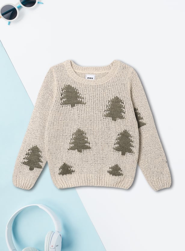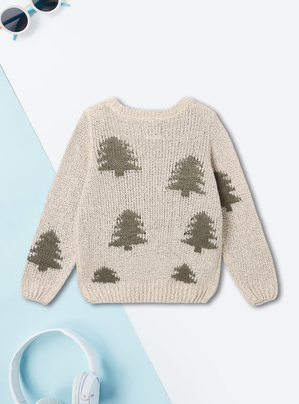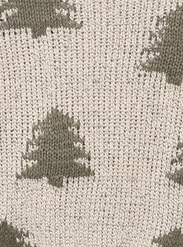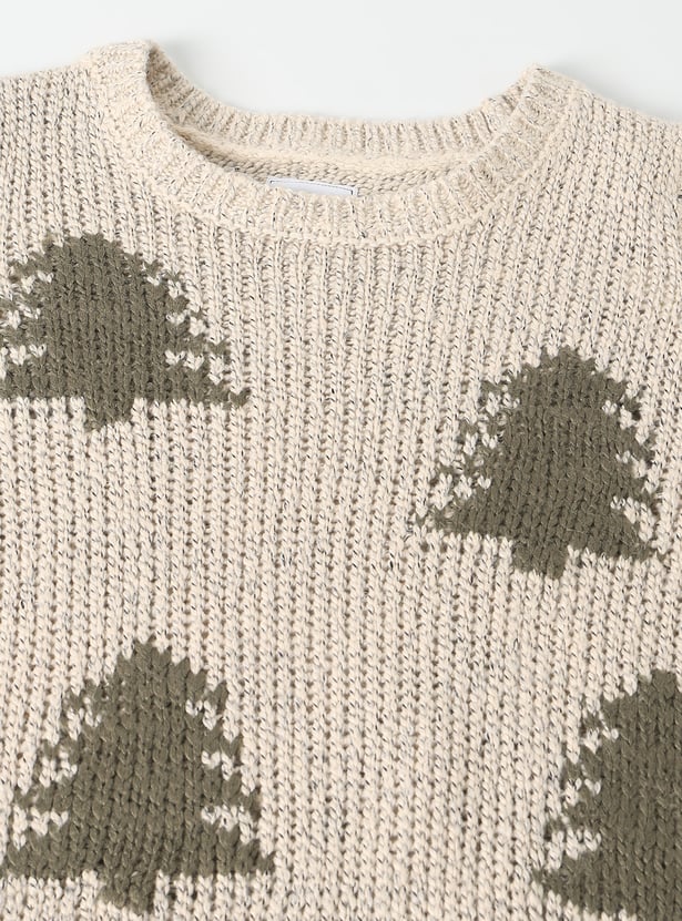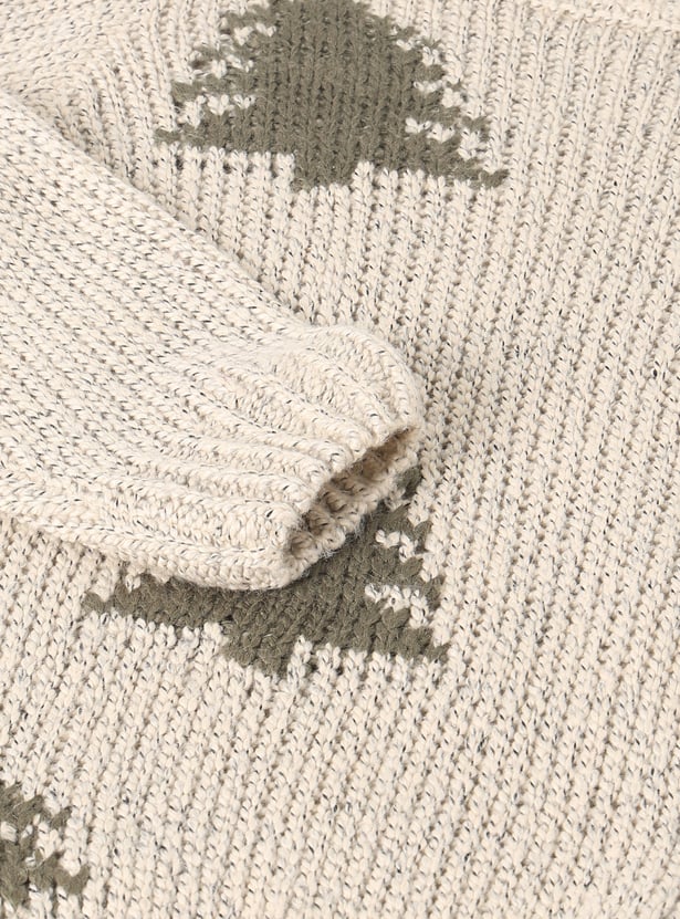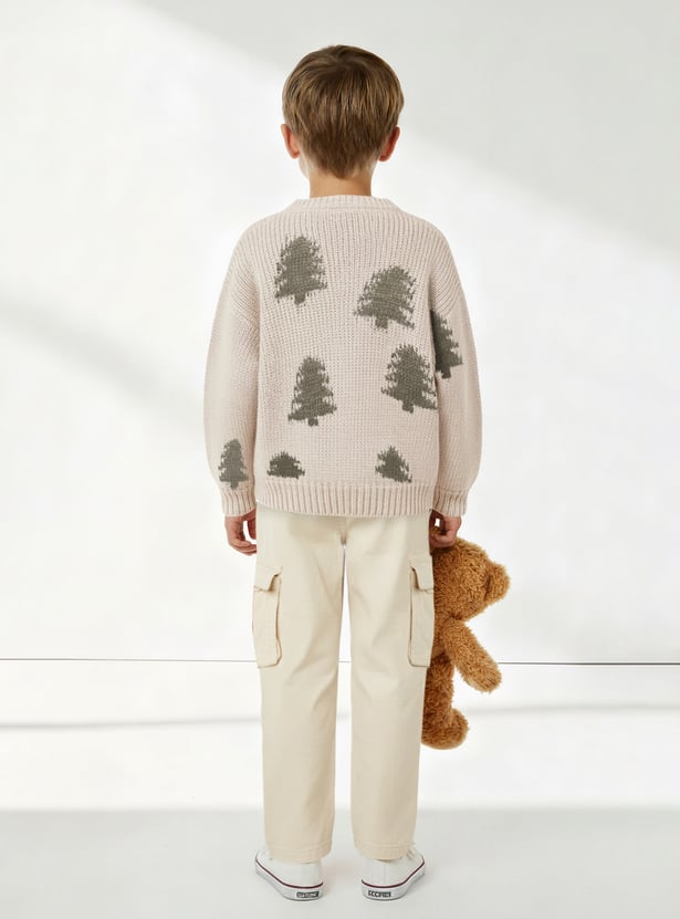 This boys’ sweater features charming Christmas tree motifs, adding a festive touch to your little one's winter wardrobe. It comes with a classic crew neck and full sleeves, ensuring warmth and comfort throughout the season.