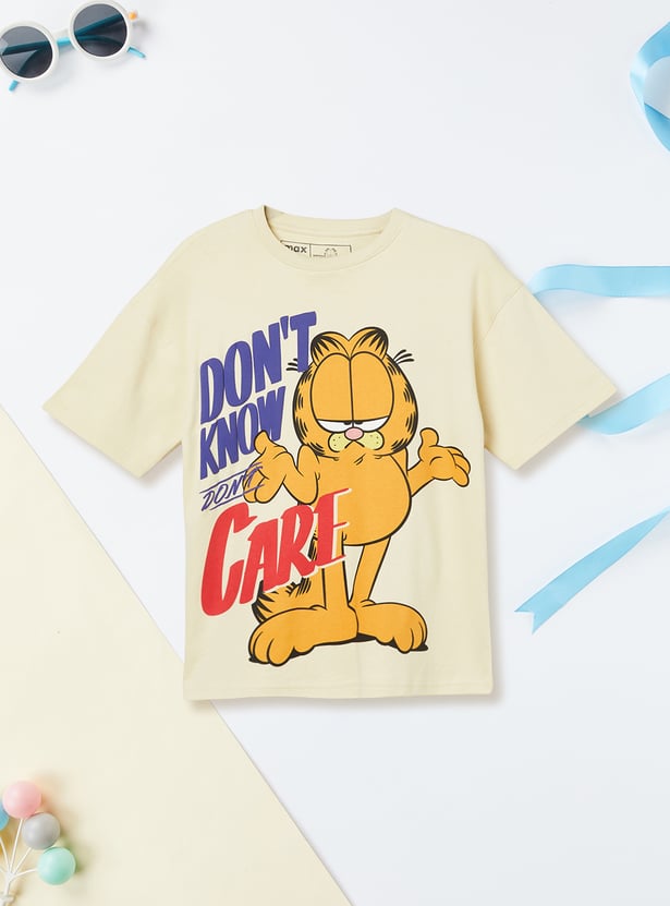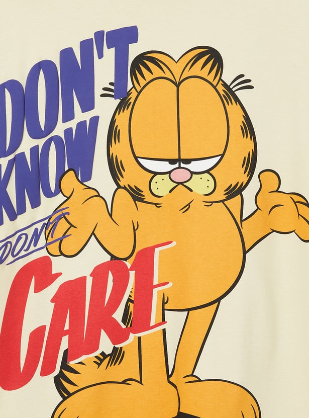 This Garfield print oversized T-shirt is a fun and relaxed casual piece. Designed with a crew neck and half sleeves, it offers a comfortable fit with a trendy oversized silhouette.