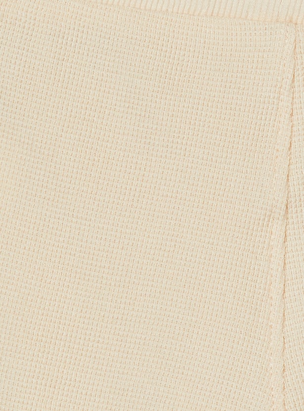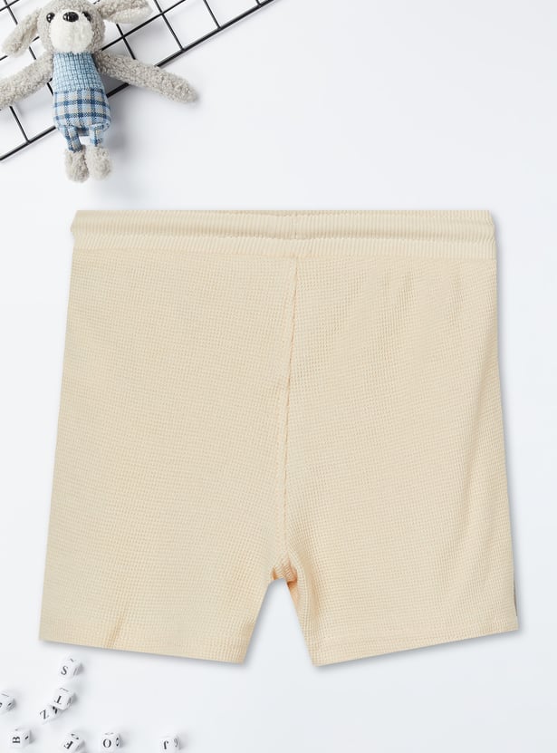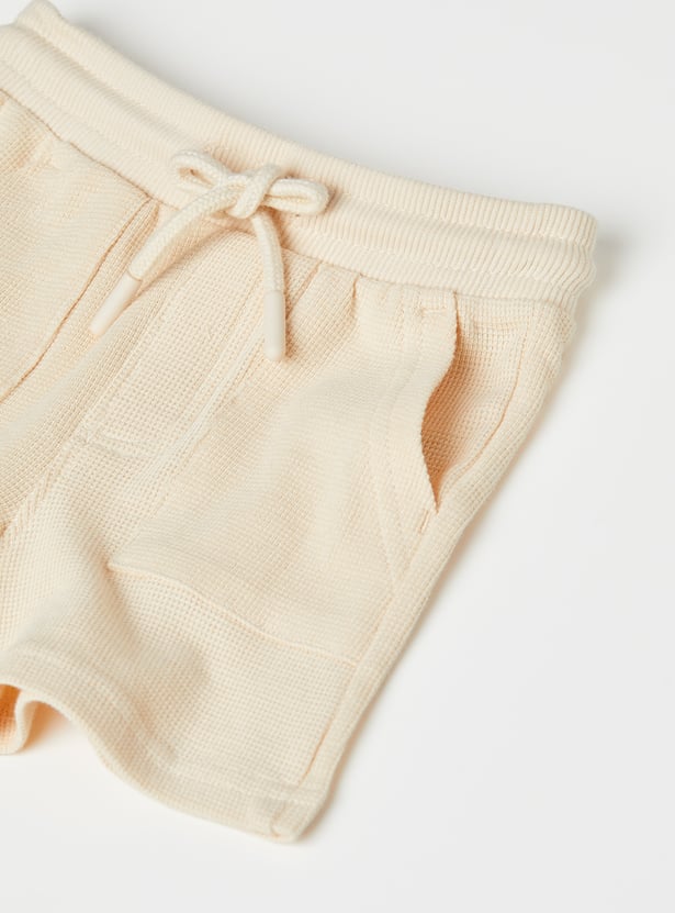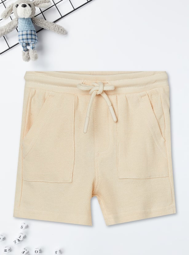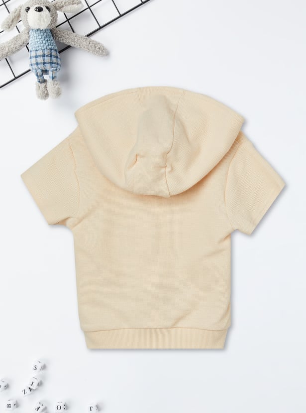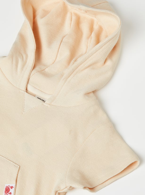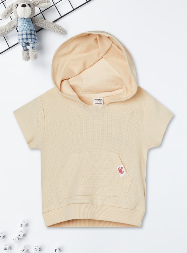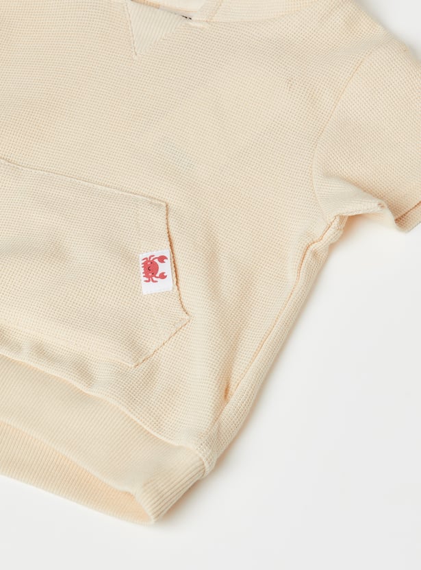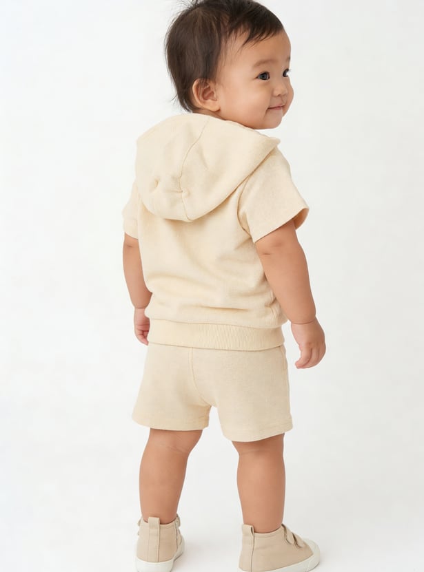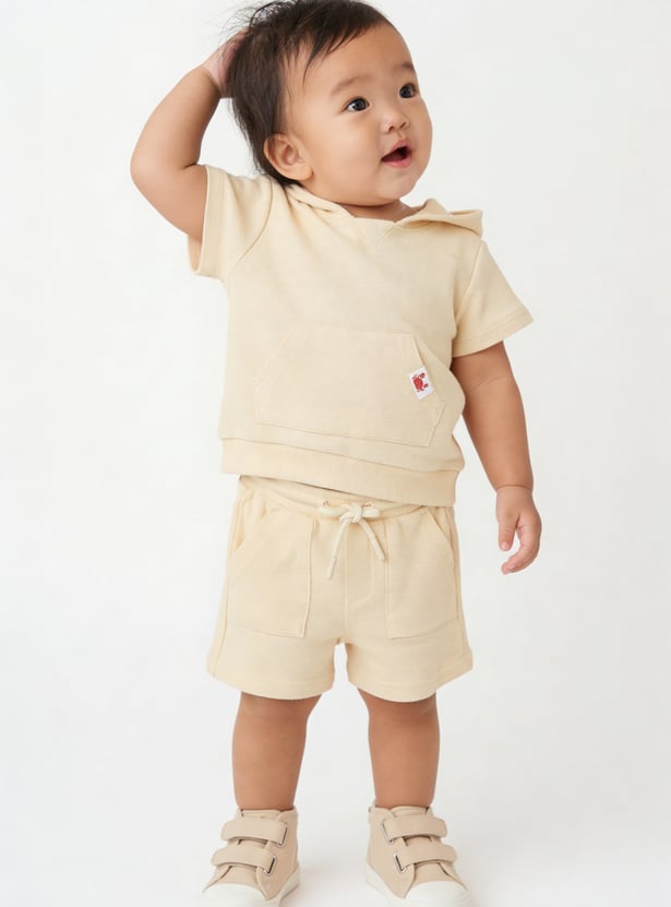Sporty comfort for everyday play, this knit shorts set features a top with a hooded neck, half sleeves, and a kangaroo pocket for a relaxed look. The shorts are designed with a drawstring waist for an adjustable fit and cross pockets for added convenience.