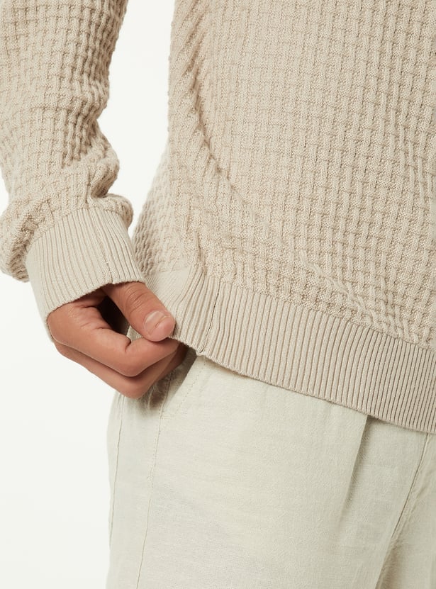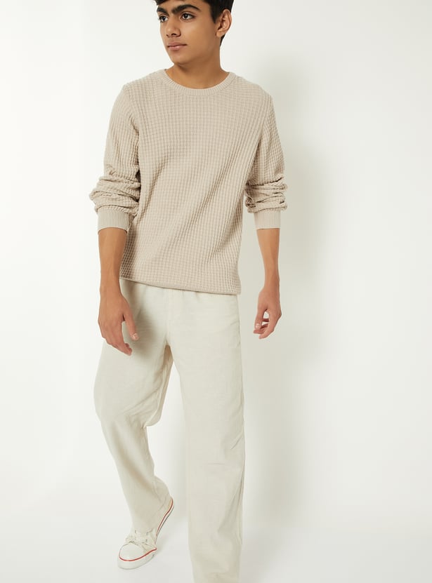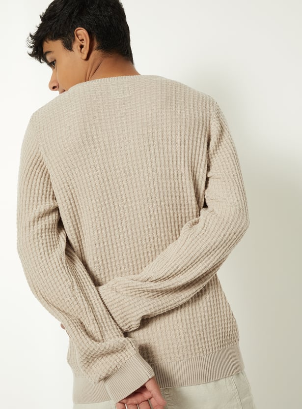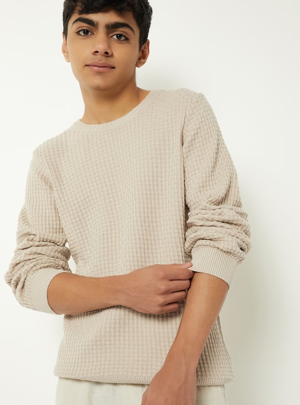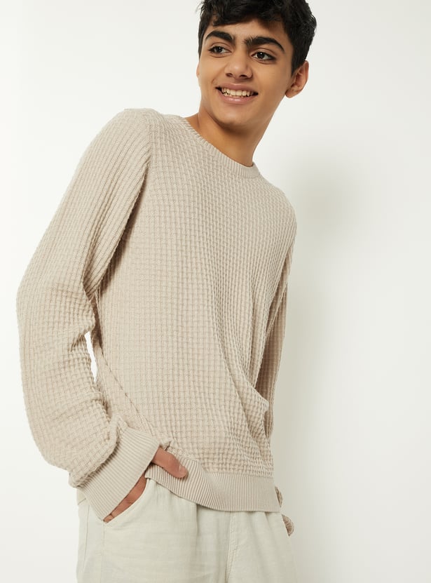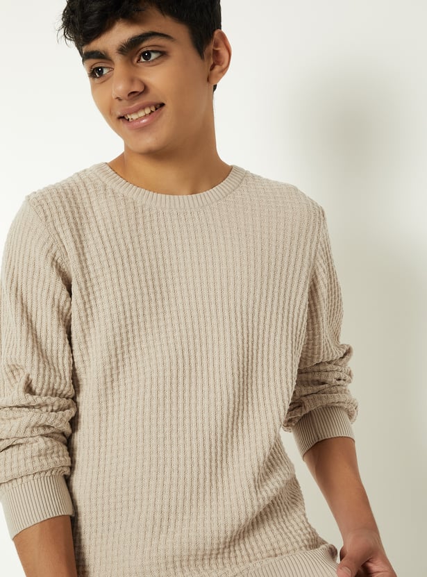 Stay cozy and chic with this knit sweater, featuring a classic crew neck, full sleeves, and a ribbed hem for a comfortable fit.