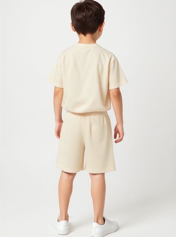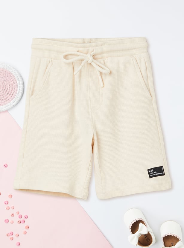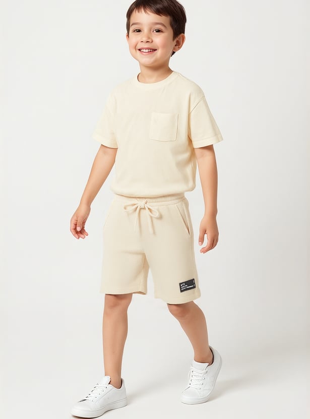 He’ll stay cool and stylish in this pair of shorts. The knit design and solid tone lend a versatile look. This pair has a drawstring waist, side pockets, and a back patch pocket.