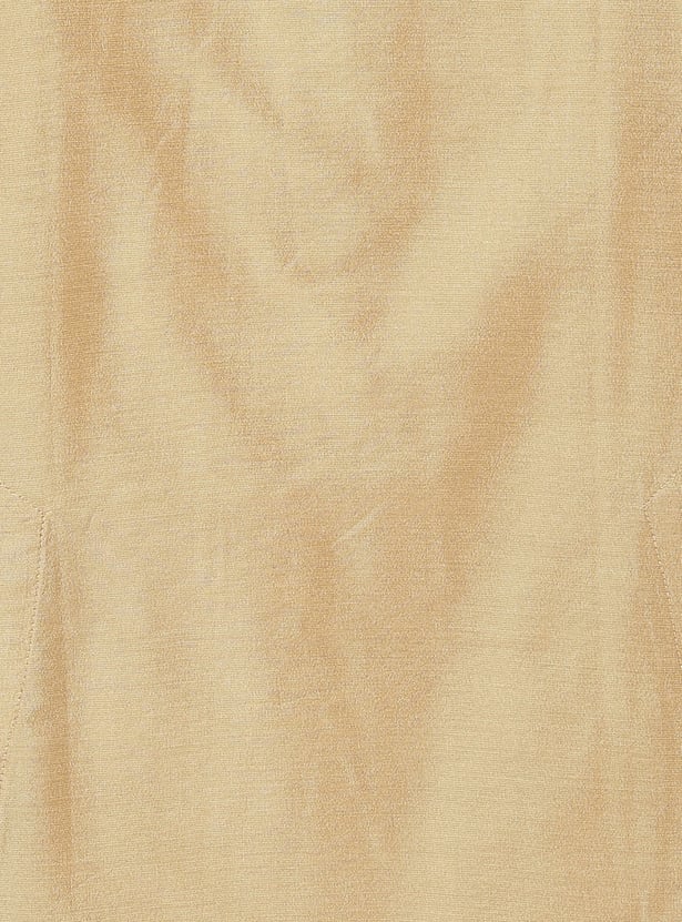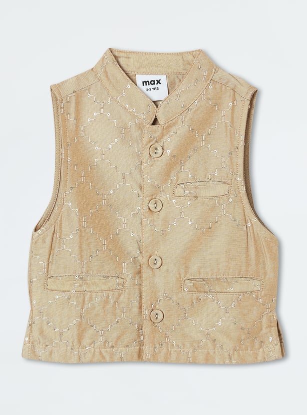 Elevate his festive look with this stylish set. The kurta features a band collar, full sleeves, and convenient waist pockets, while the pyjamas offer all-day comfort with an elasticated waist. Completing the look, the Nehru jacket showcases intricate embroidery with sequins, a Mandarin collar, and welt pockets, adding a refined finish.