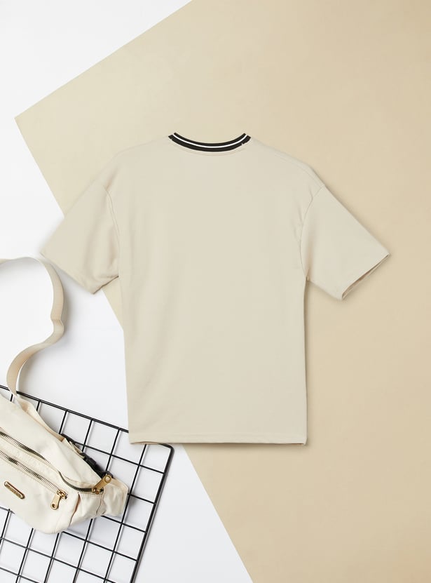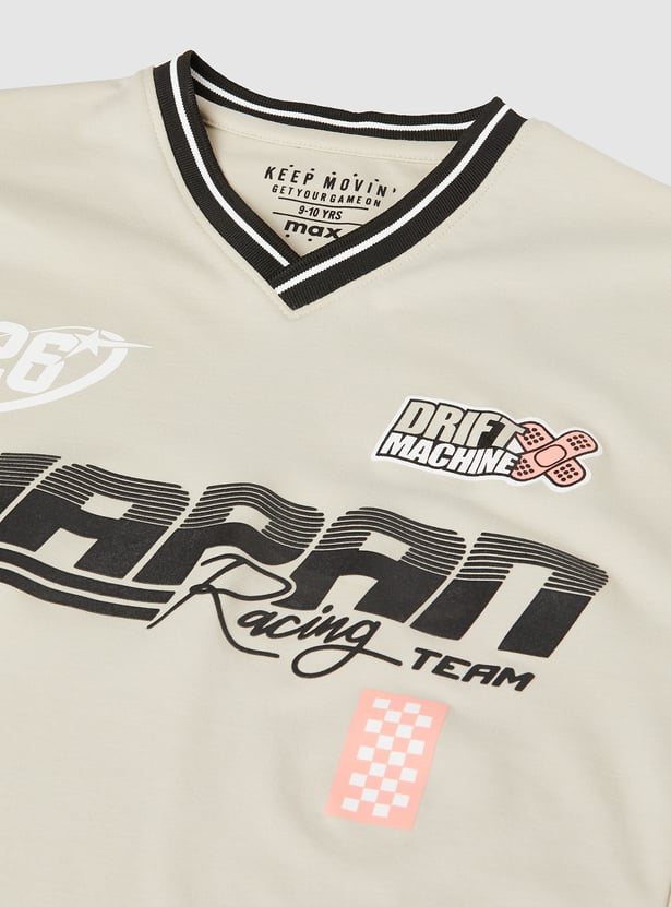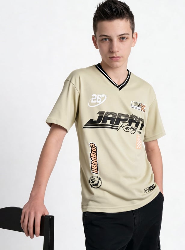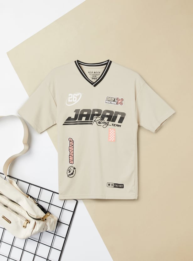 Sporty style meets relaxed comfort in this T-shirt. Designed with a striped V-neck and comfortable half sleeves, it features an easy, oversized fit for a laid-back look. The bold front print adds a fun, standout touch.