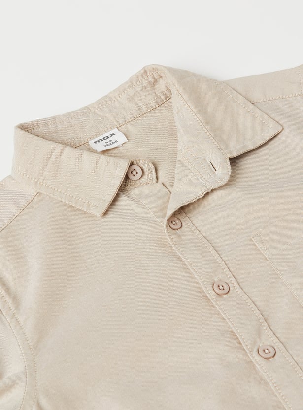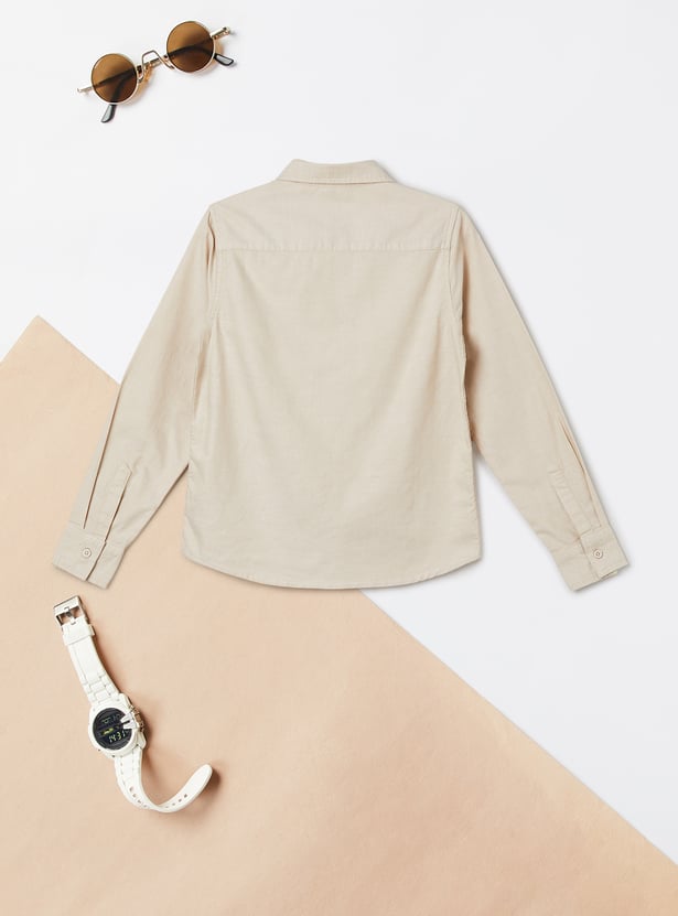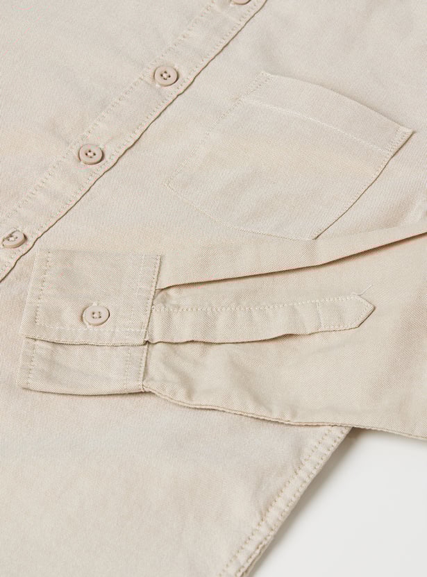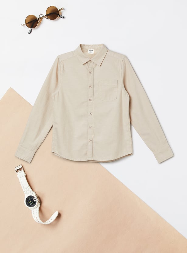 Give his wardrobe a cool upgrade with this oversized solid shirt, styled with a crisp spread collar and full sleeves finished with buttoned cuffs for a tailored touch. The button placket adds classic structure, while the patch pocket brings in everyday utility.