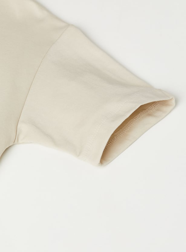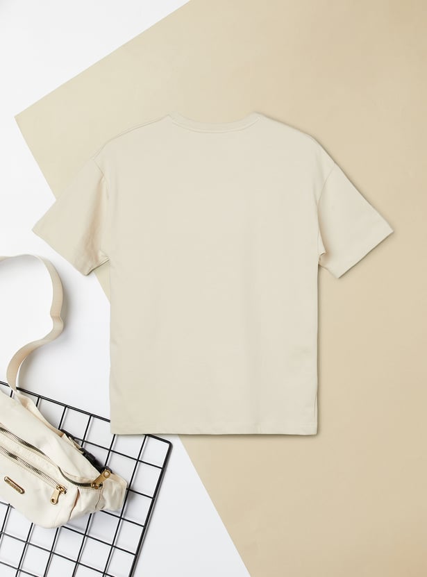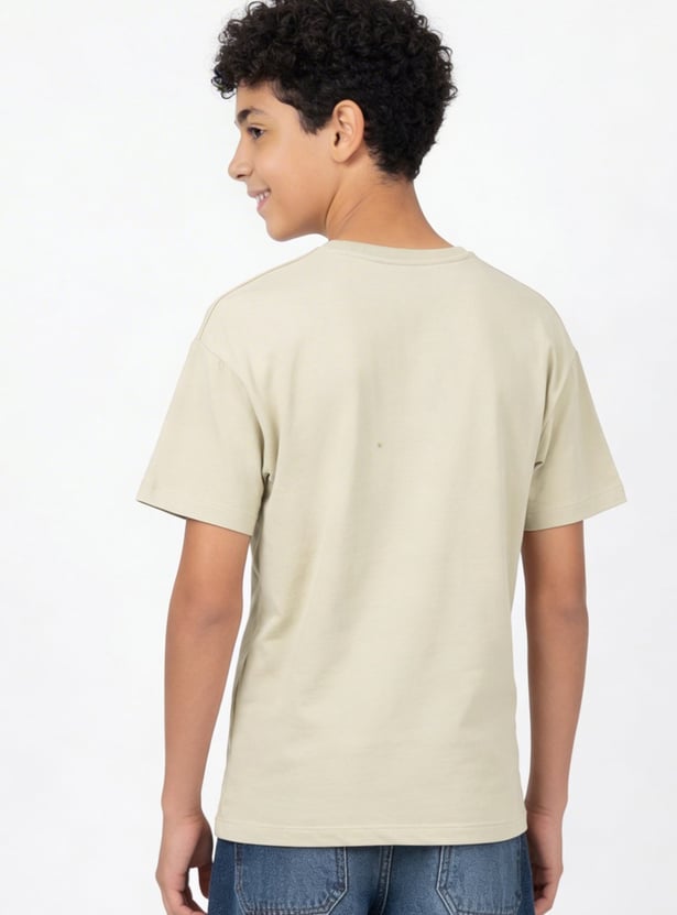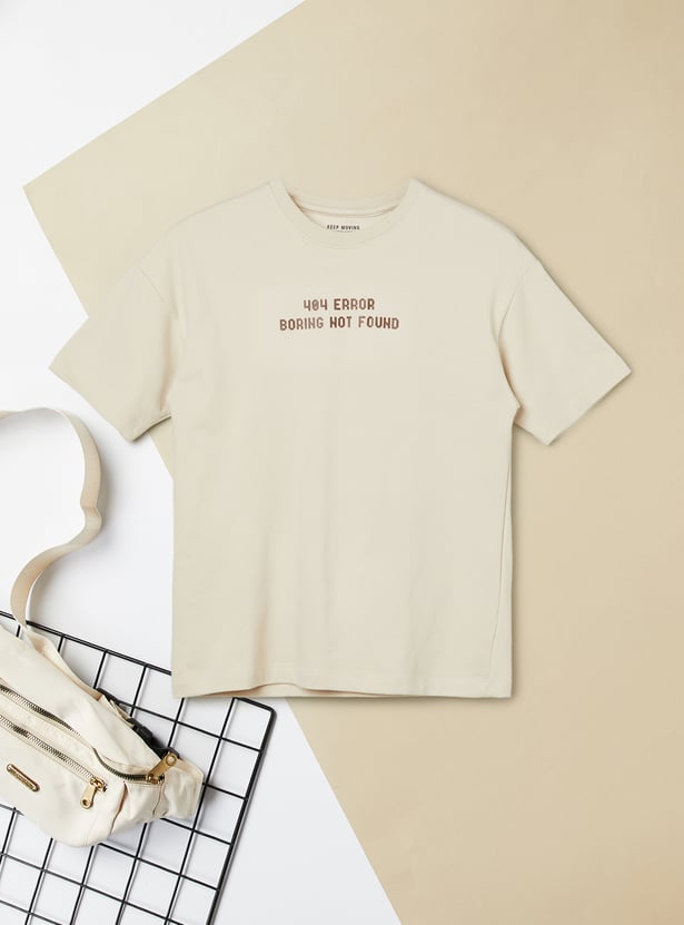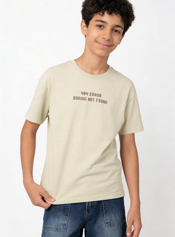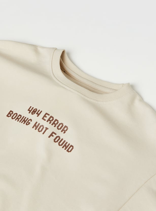 Add a cool street-style vibe to his casual wardrobe with this oversized T-shirt. Designed with a crew neck and half sleeves, it features a quirky typographic print on the chest for a standout look.