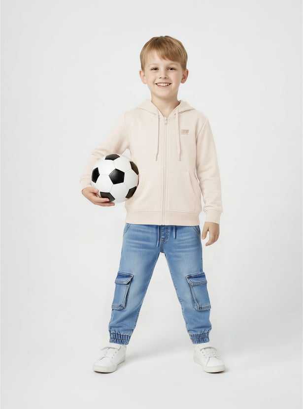 This boys’ minimal printed hooded sweatshirt blends comfort with effortless style. Designed with full sleeves, a cozy hood, and practical pockets, it features a subtle print that adds a modern touch to his casual look.
