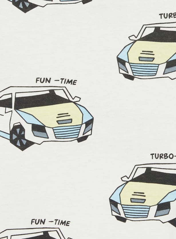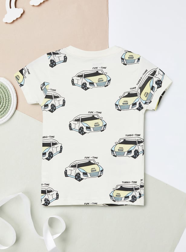 This printed T-shirt features a classic crew neck and half sleeves, offering all-day comfort with a fun all-over print that brightens up your little one's everyday style.