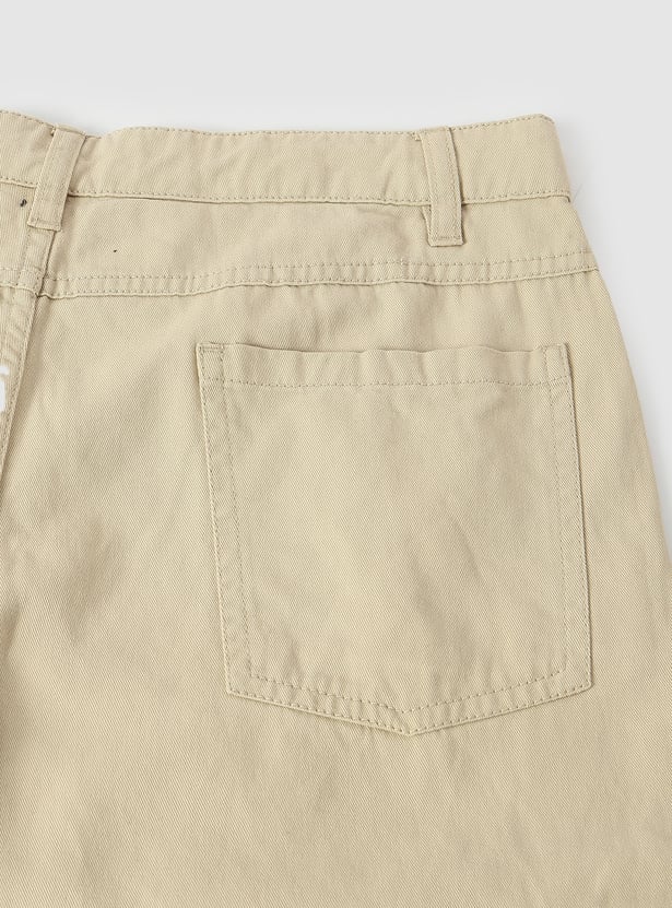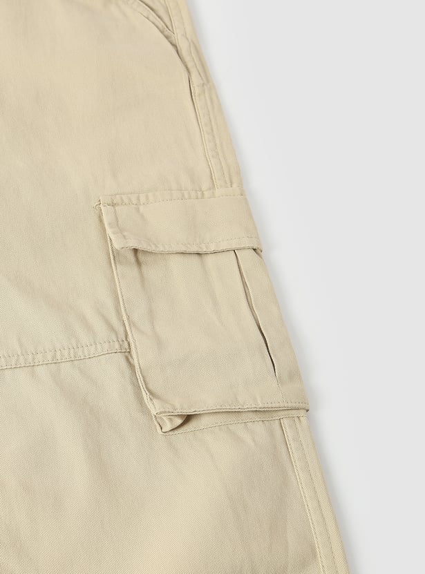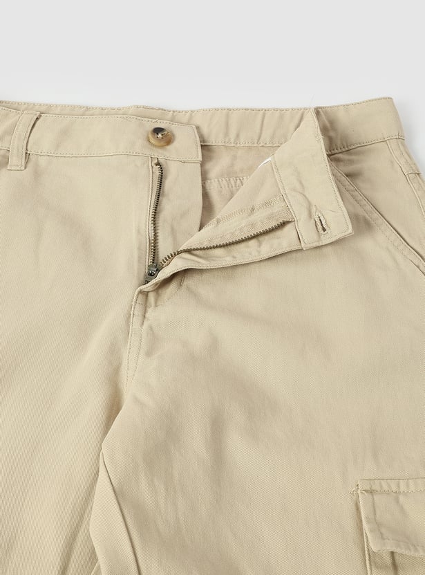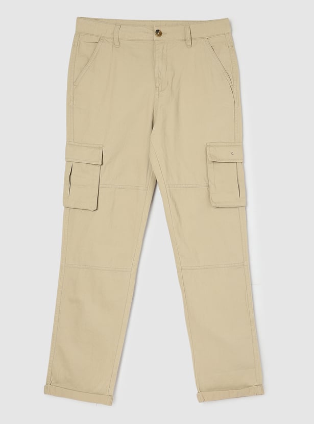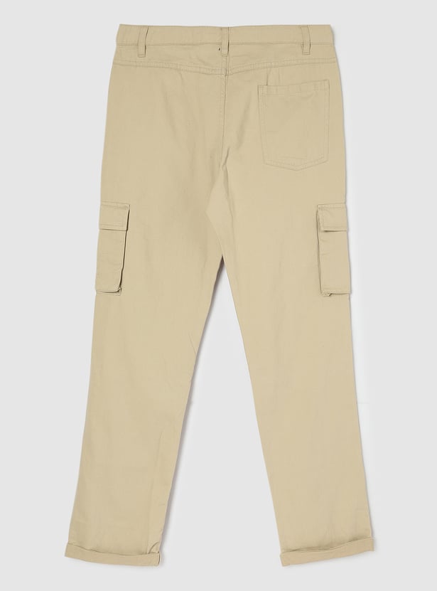 Smarten up his casual style with this pair of solid-tone trousers. Featuring a button and zip closure, slant pockets, a side cargo pocket, and a back patch pocket, these trousers are both functional and fashionable.