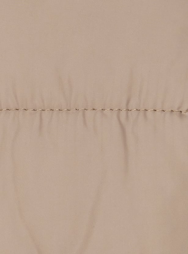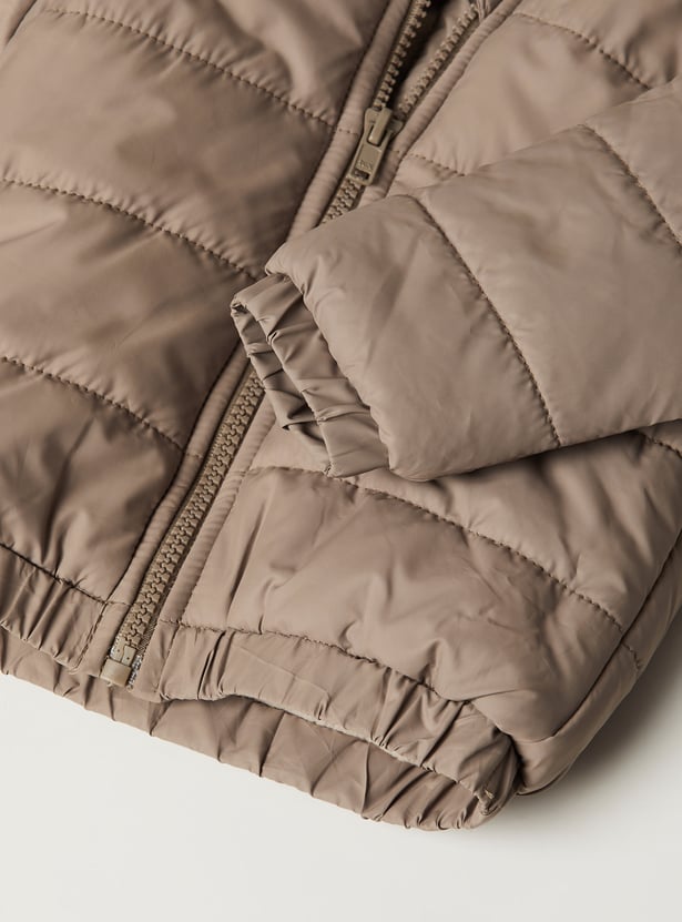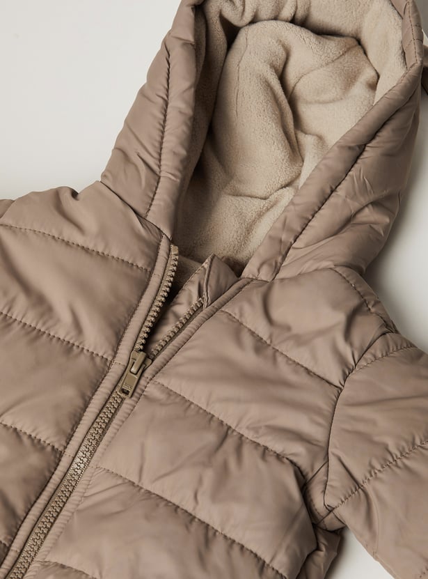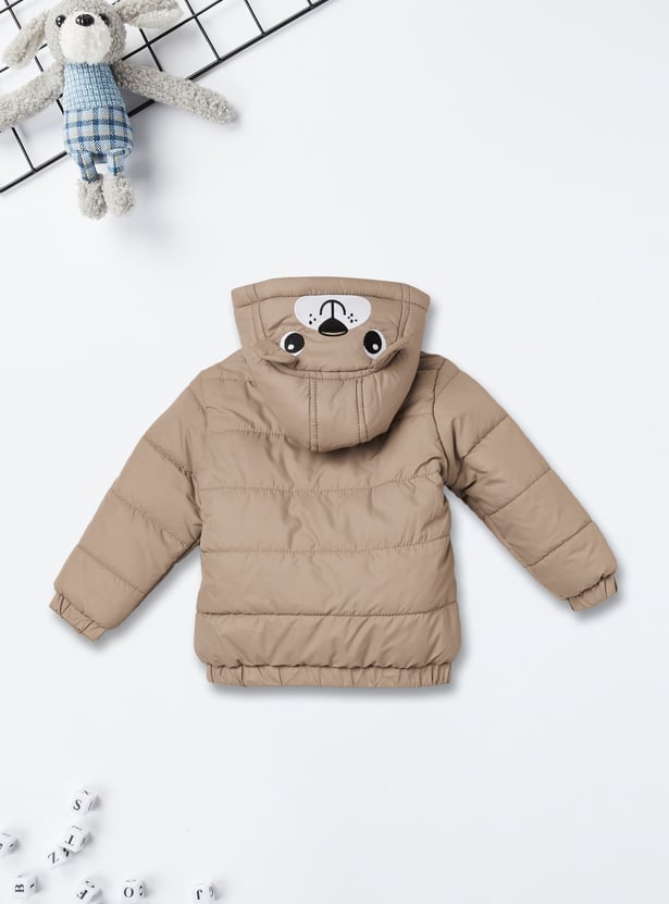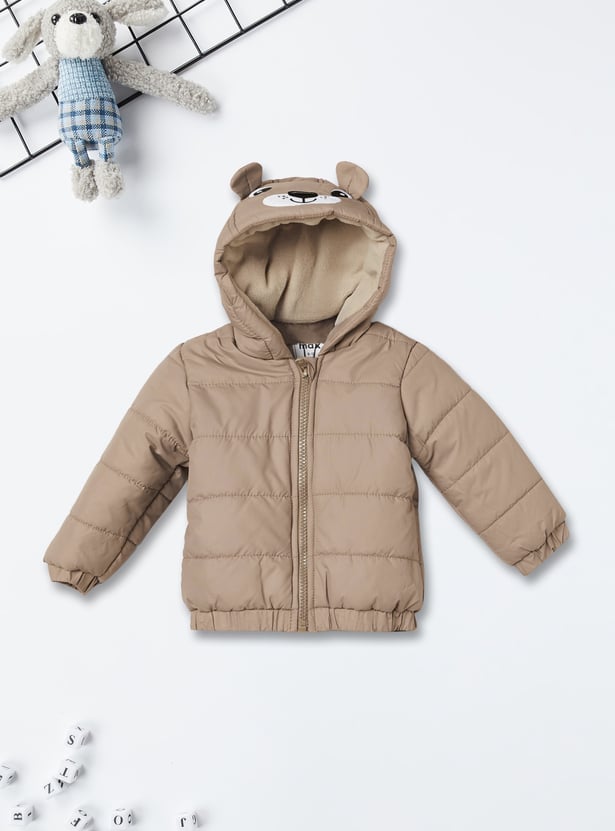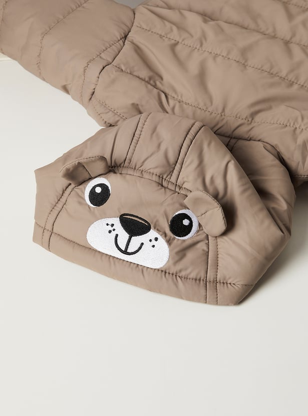 Stay warm and stylish in this solid padded hooded jacket, featuring a zip closure and handy pockets for convenience. The hood is accented with playful appliqué detailing, adding a fun touch to your winter wardrobe.