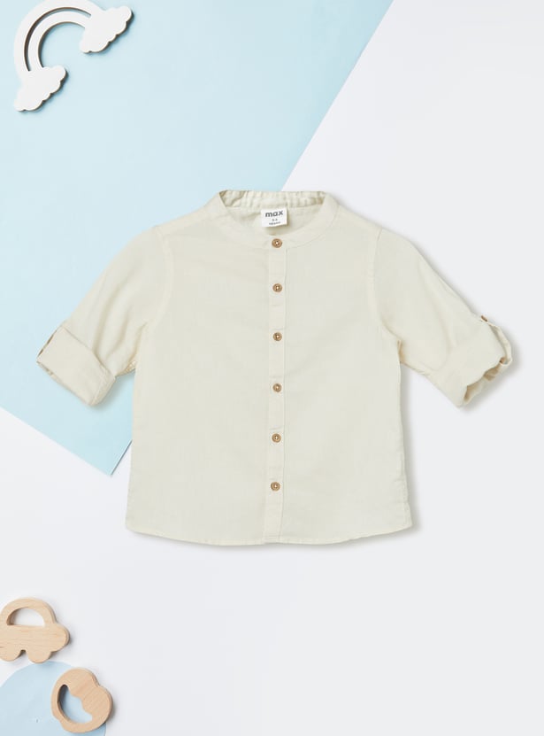 Add a refined touch to your wardrobe with this solid shirt. Featuring a sleek band collar, button placket, and full sleeves with fold tabs, it blends modern minimalism with practical detailing.