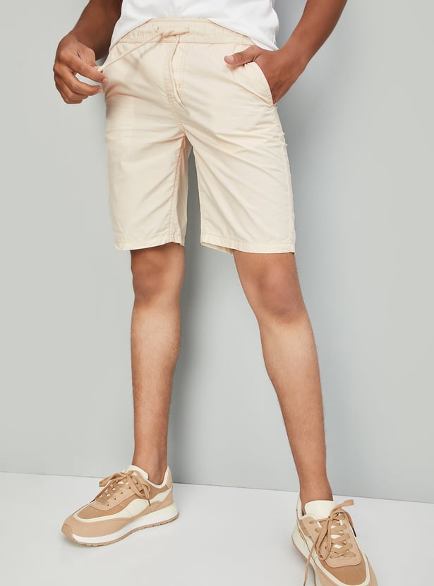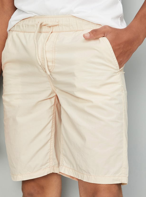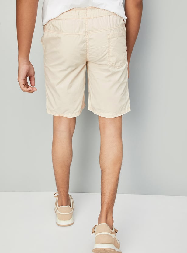 Summer calls for the style and comfort this pair of shorts offers. It is rendered in a solid tone with a drawstring waist, side pockets, and a back patch pocket.